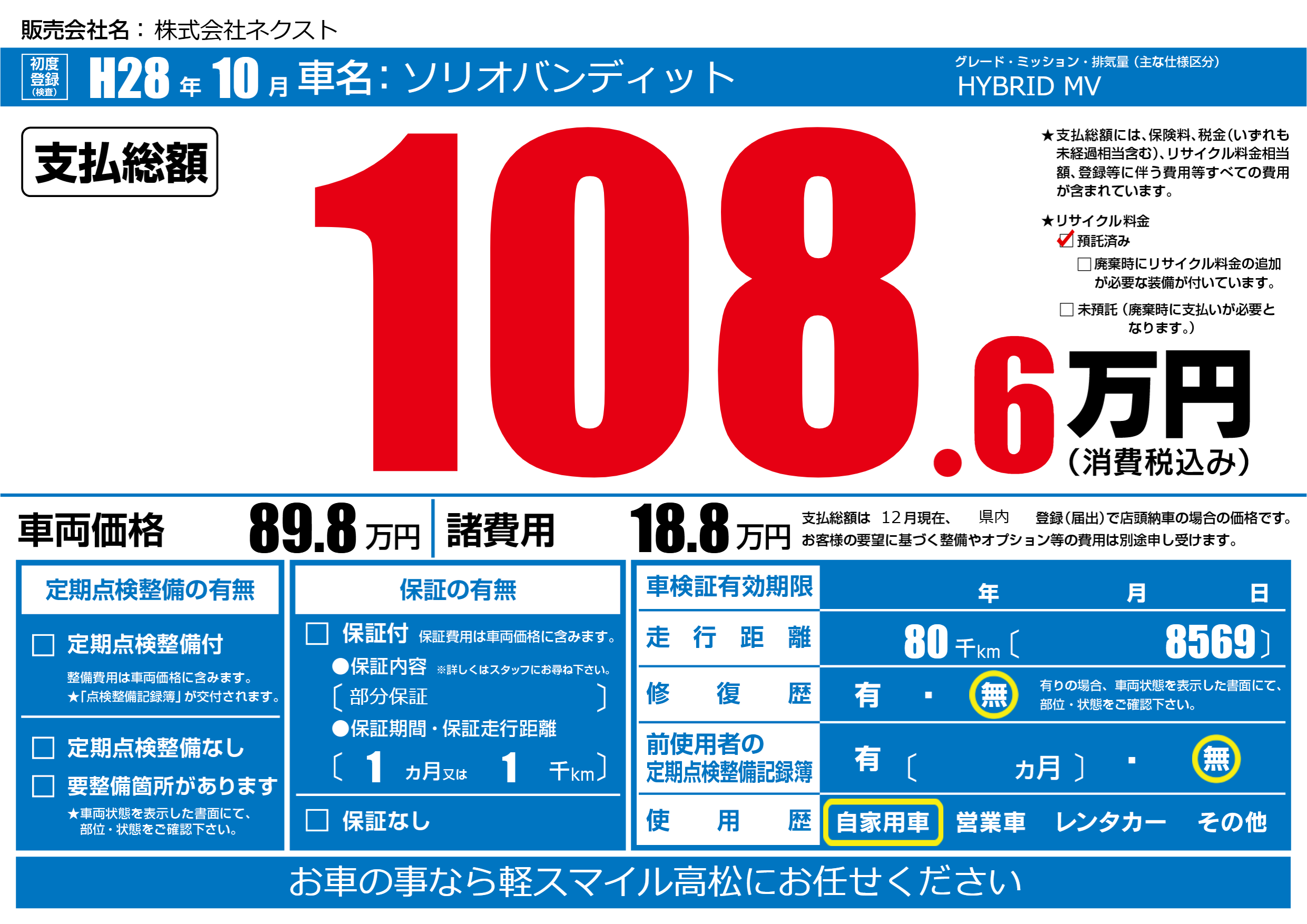 | 走行キロ | 8万km | 初年度登録 | H28年10月 |