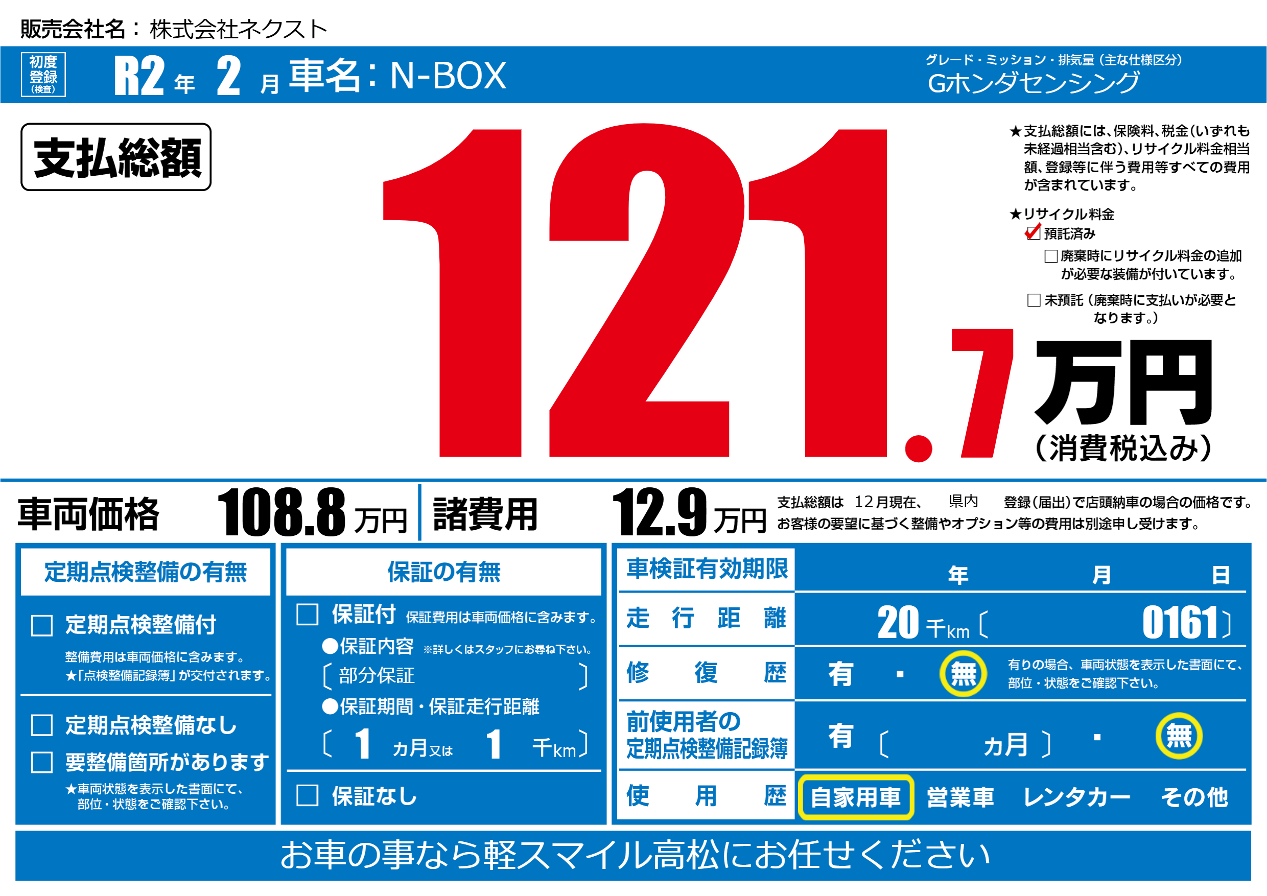 | 車名 | N-BOX | グレード ミッション 排気量 |