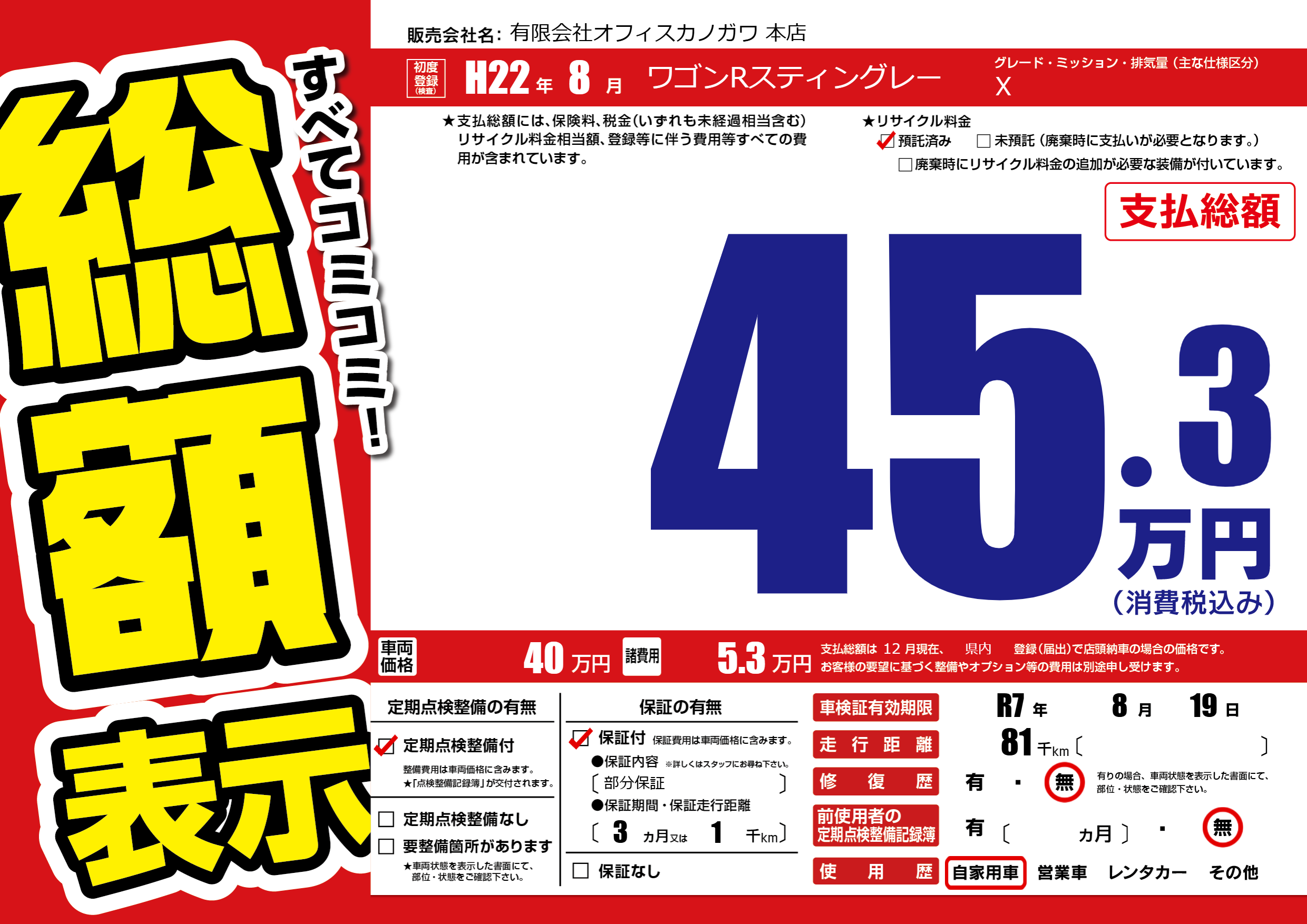 | 走行キロ | 8.1万km | 初年度登録 | H22年8月 |