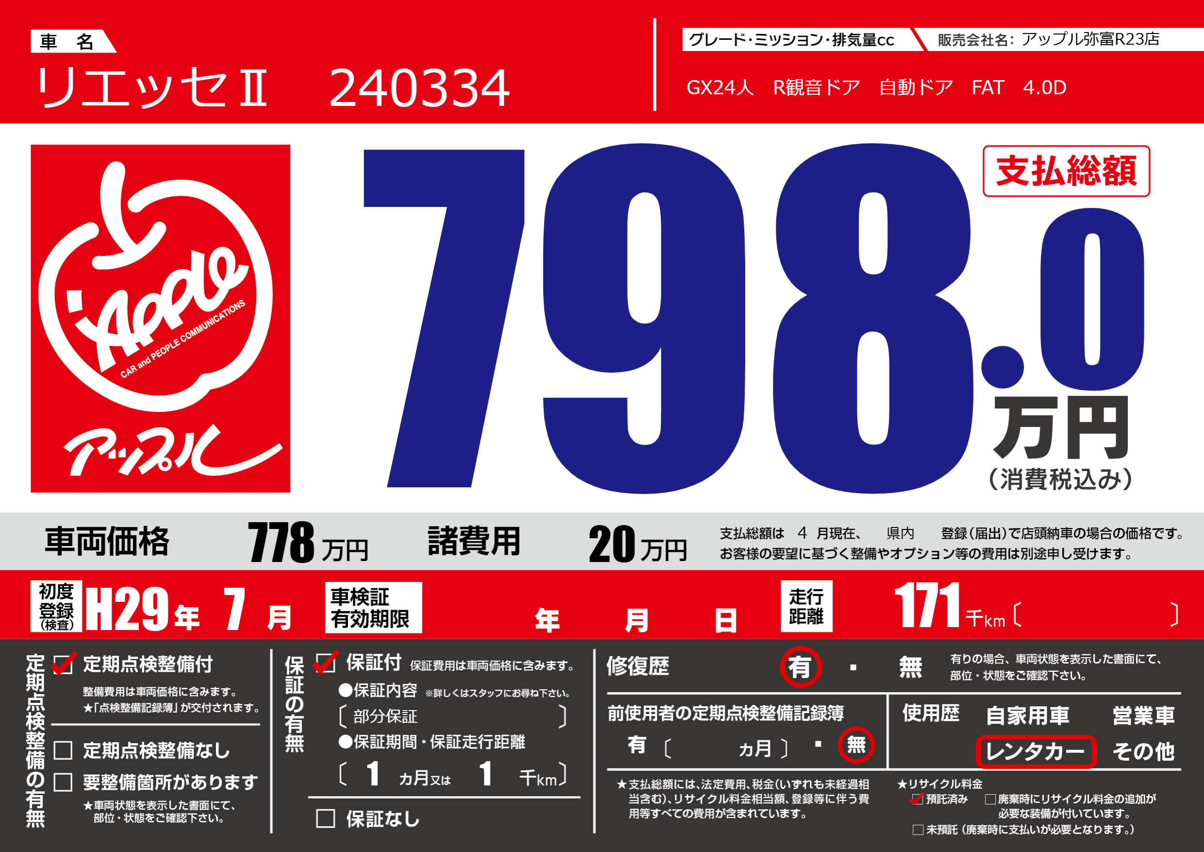 | 車名 | リエッセⅡ 240334 | グレード ミッション 排気量 |
