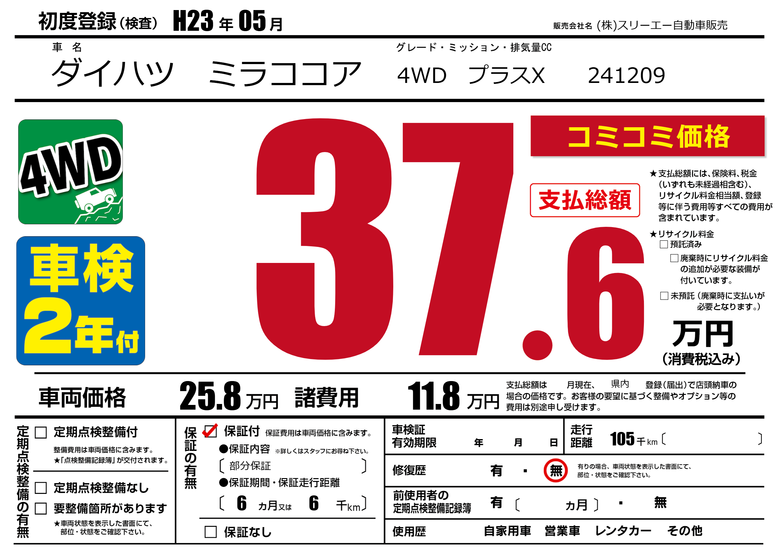| 走行キロ | 10.5万km | 初年度登録 | H23年05月 |
