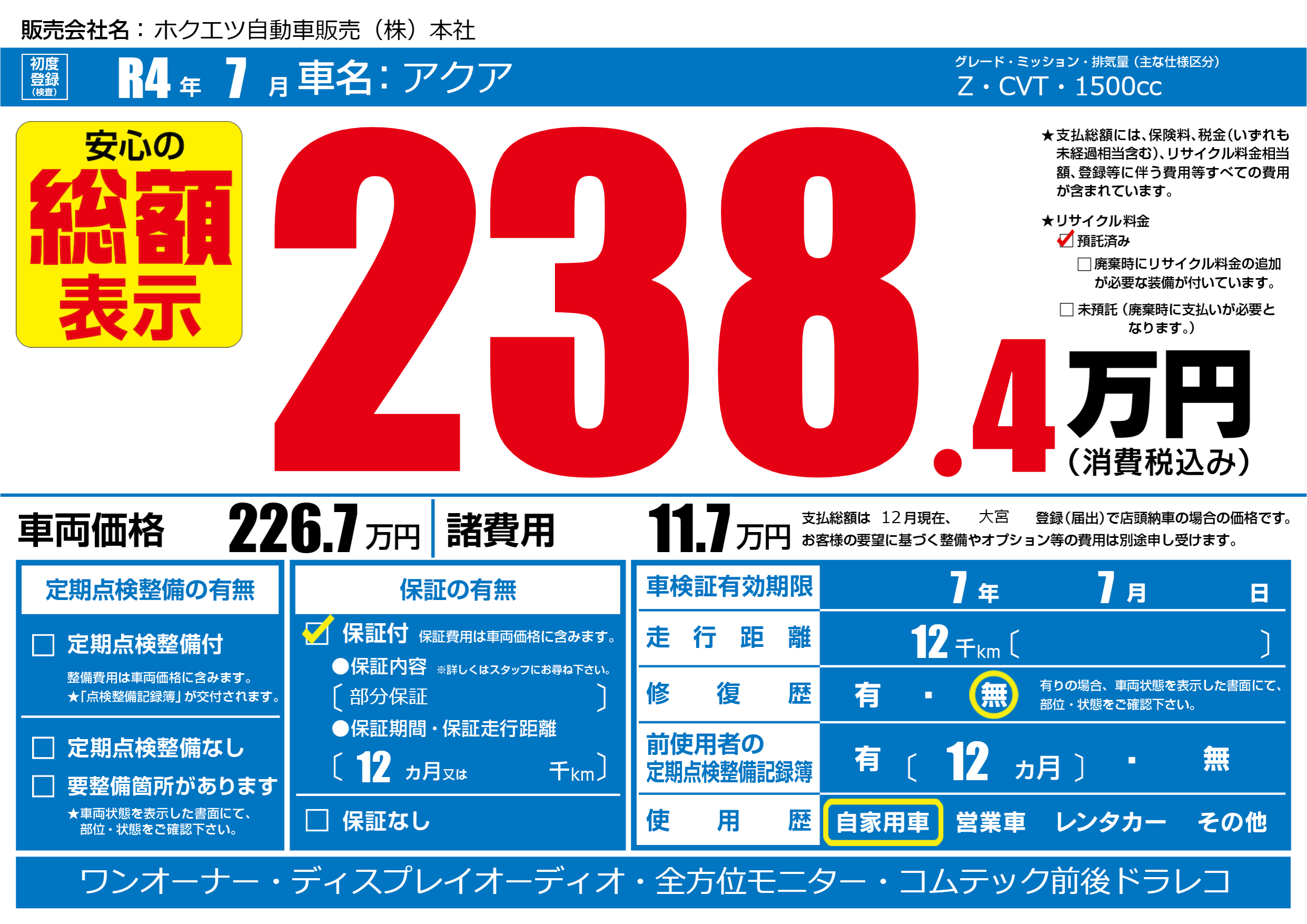 保証付き 保証内容(部分保証) 12ヶ月または()千kmまで |