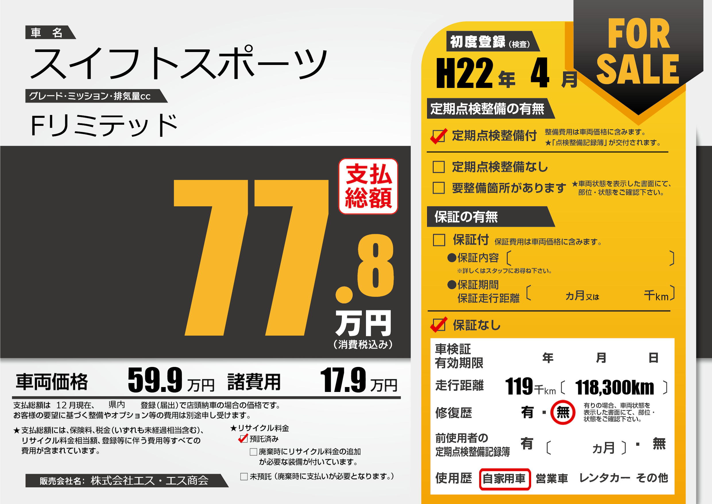 | 車名 | スイフトスポーツ | グレード ミッション 排気量 |