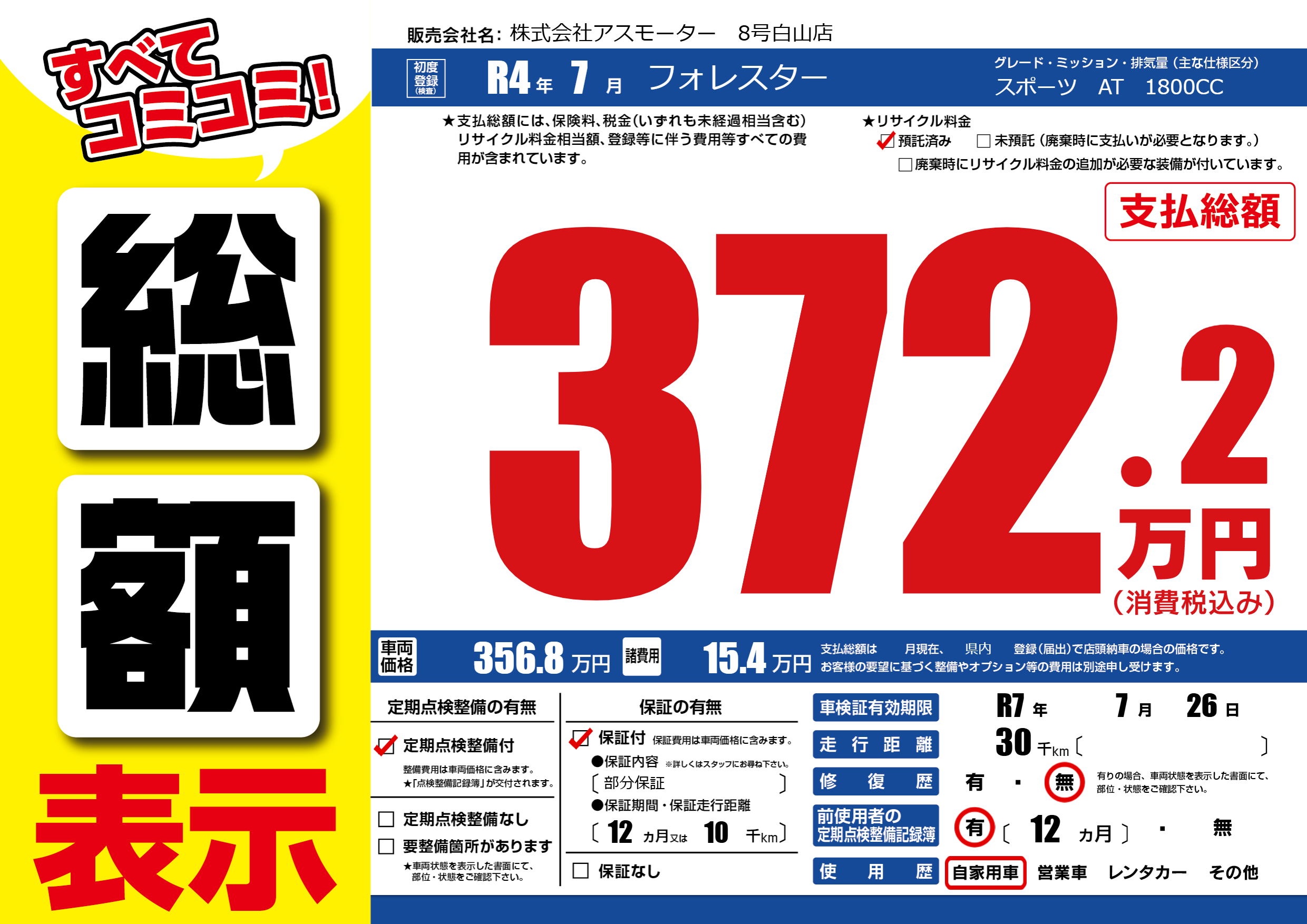 | 車名 | フォレスター | グレード ミッション 排気量 |