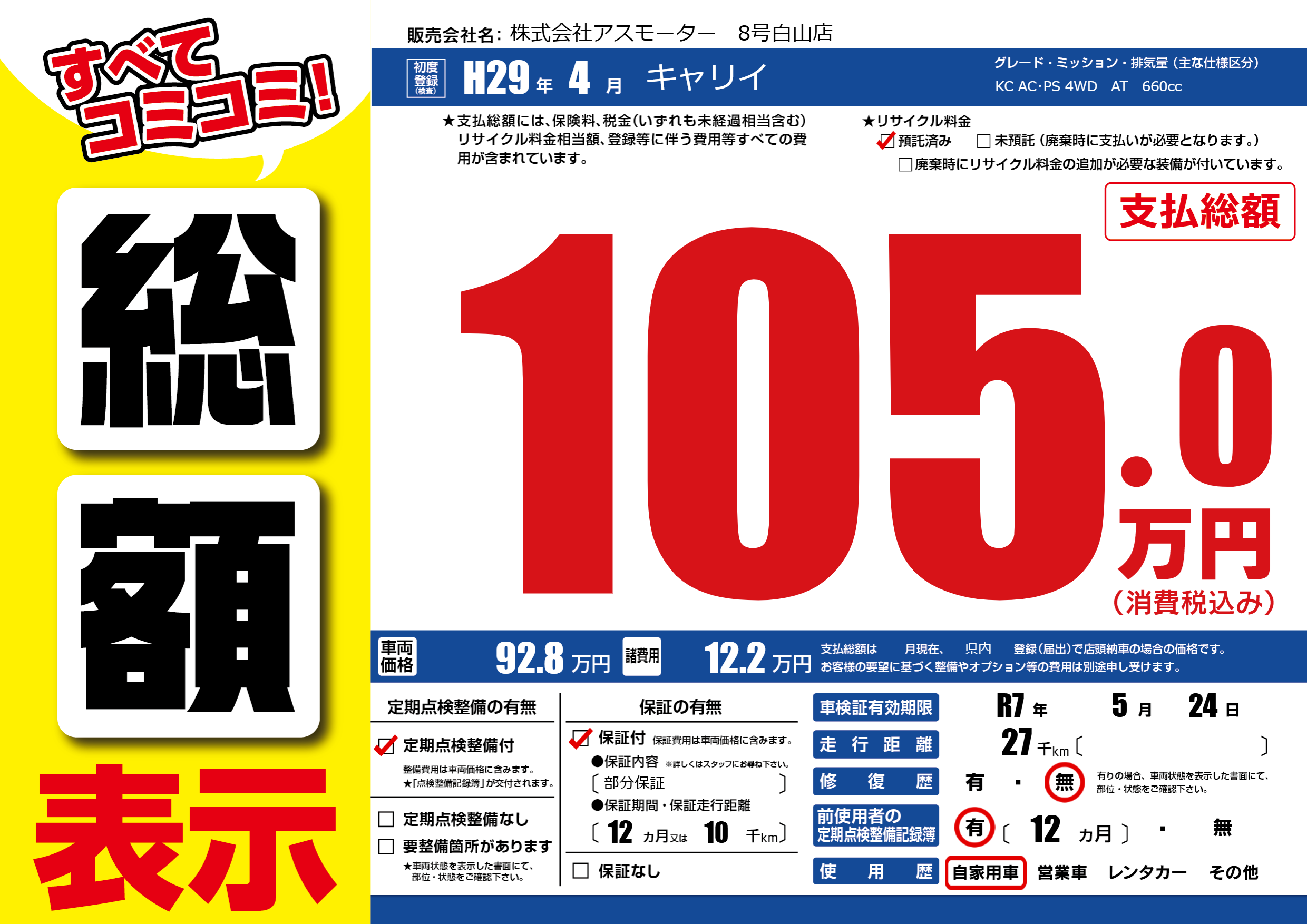 | 車名 | キャリイ | グレード ミッション 排気量 |