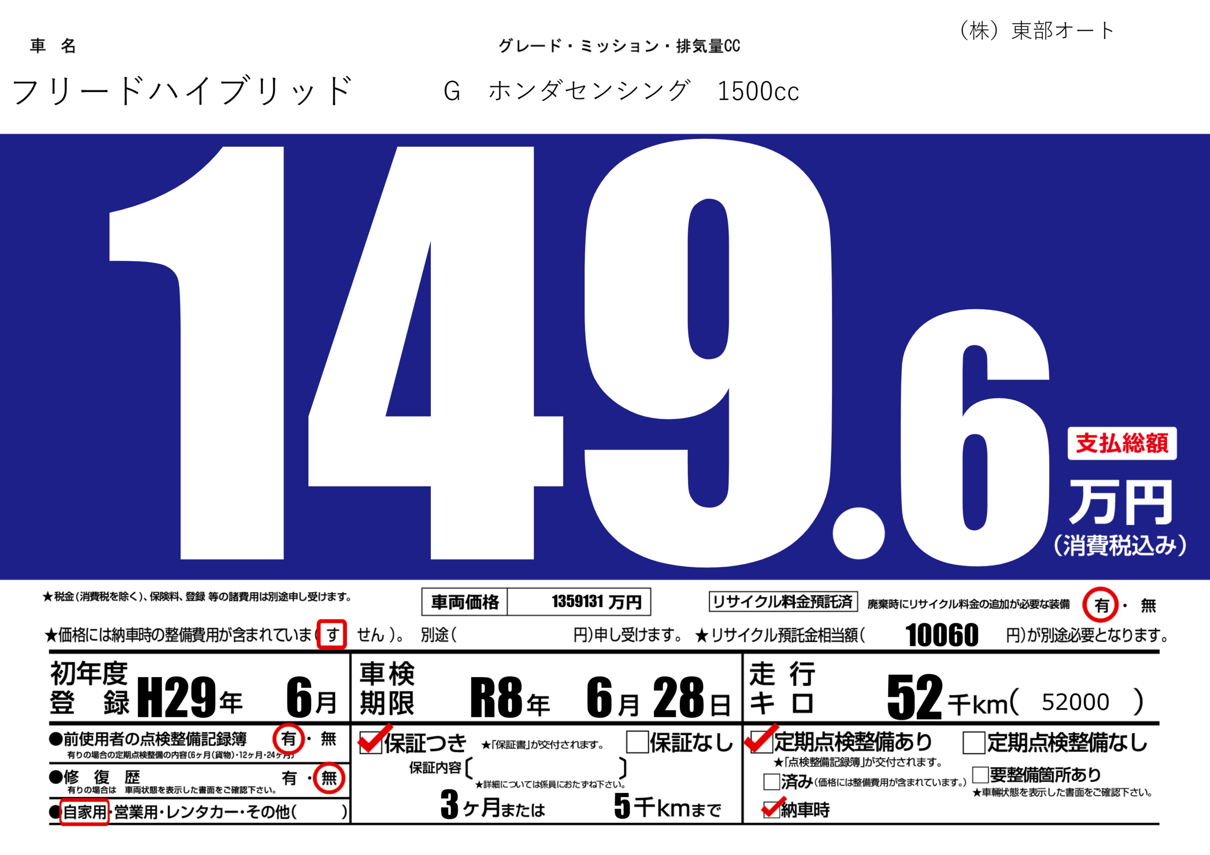 | 車名 | フリードハイブリッド | グレード ミッション 排気量 |