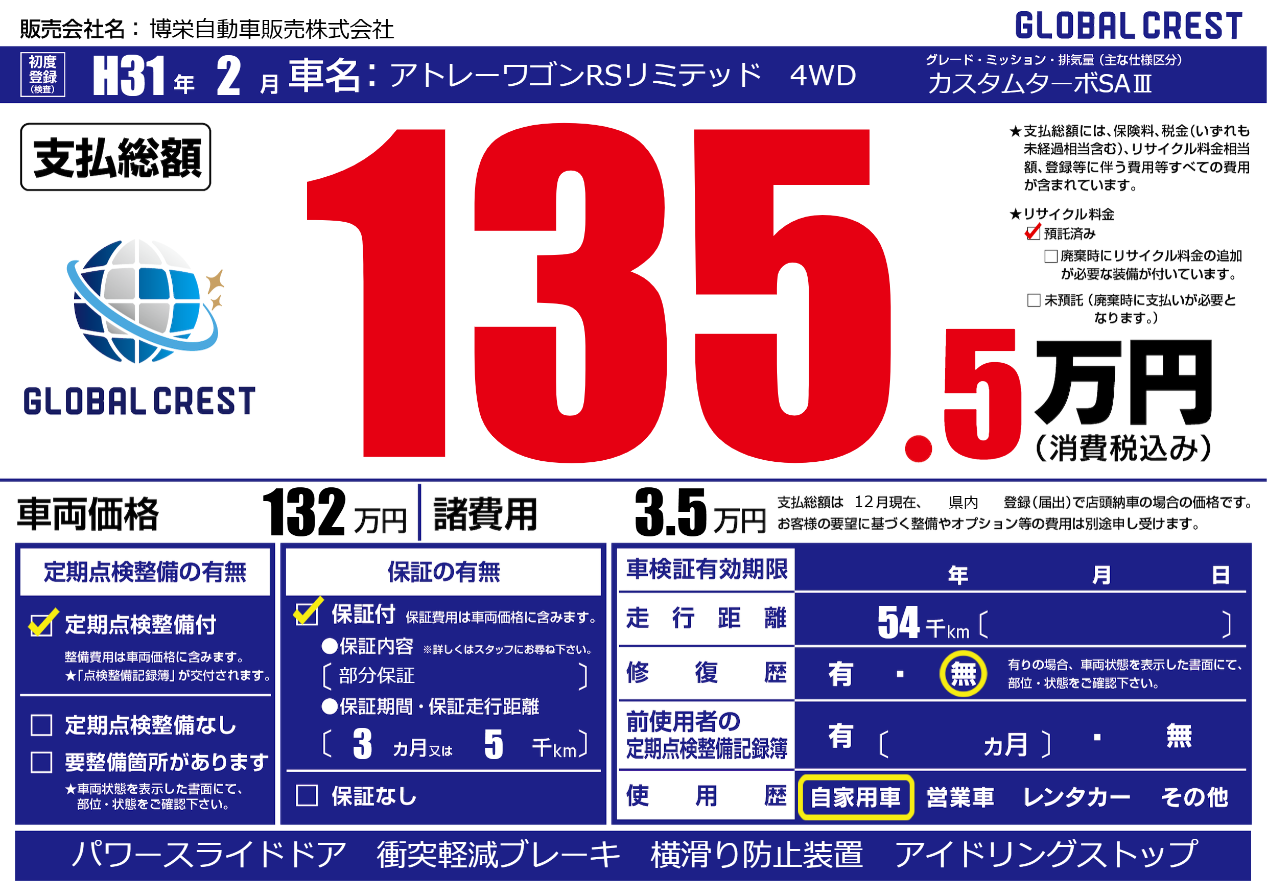 | 走行キロ | 5.4万km | 初年度登録 | H31年2月 |