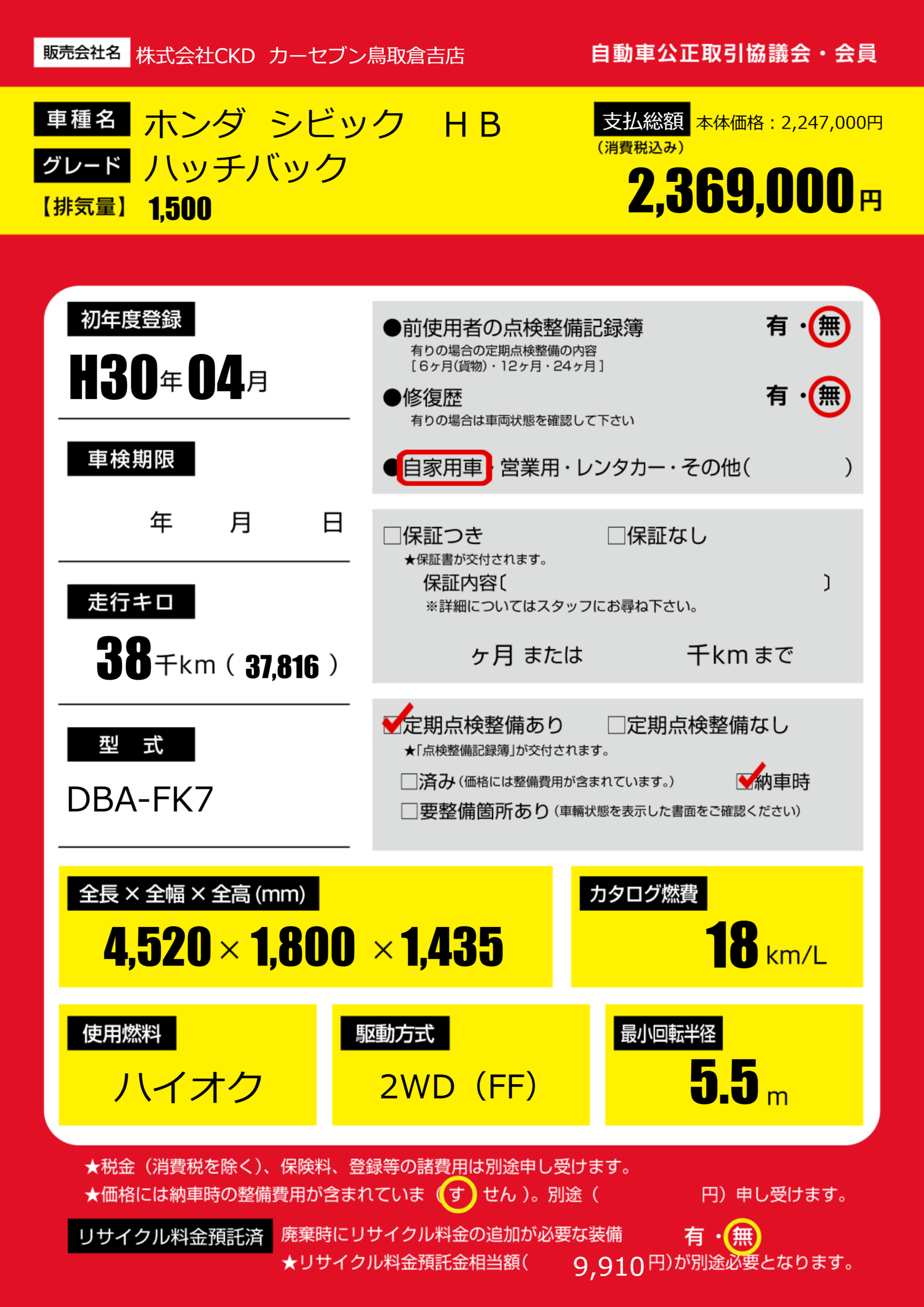 | 走行キロ | 3.8万km | 初年度登録 | H30年04月 |