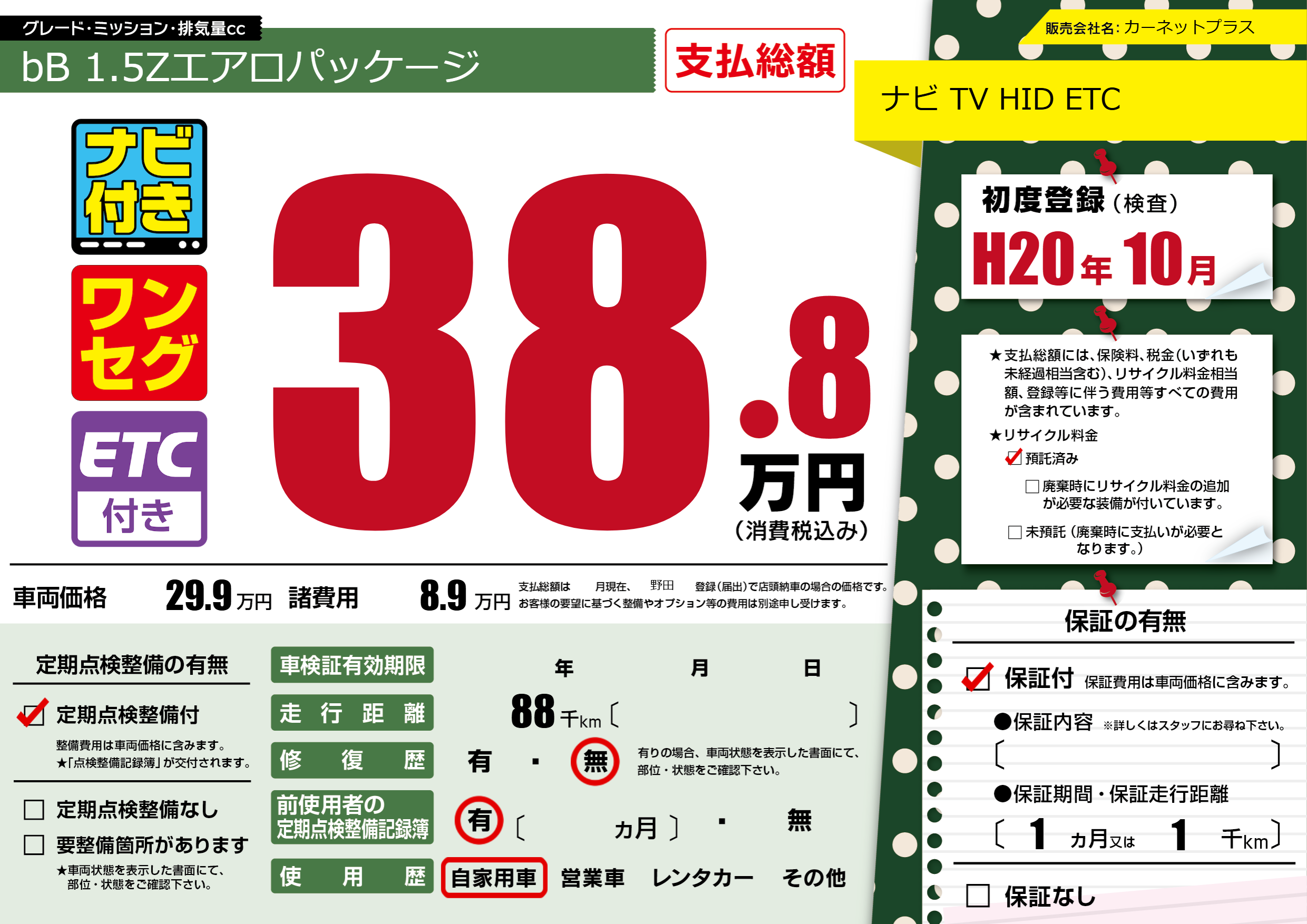 | 走行キロ | 8.8万km | 初年度登録 | H20年10月 |