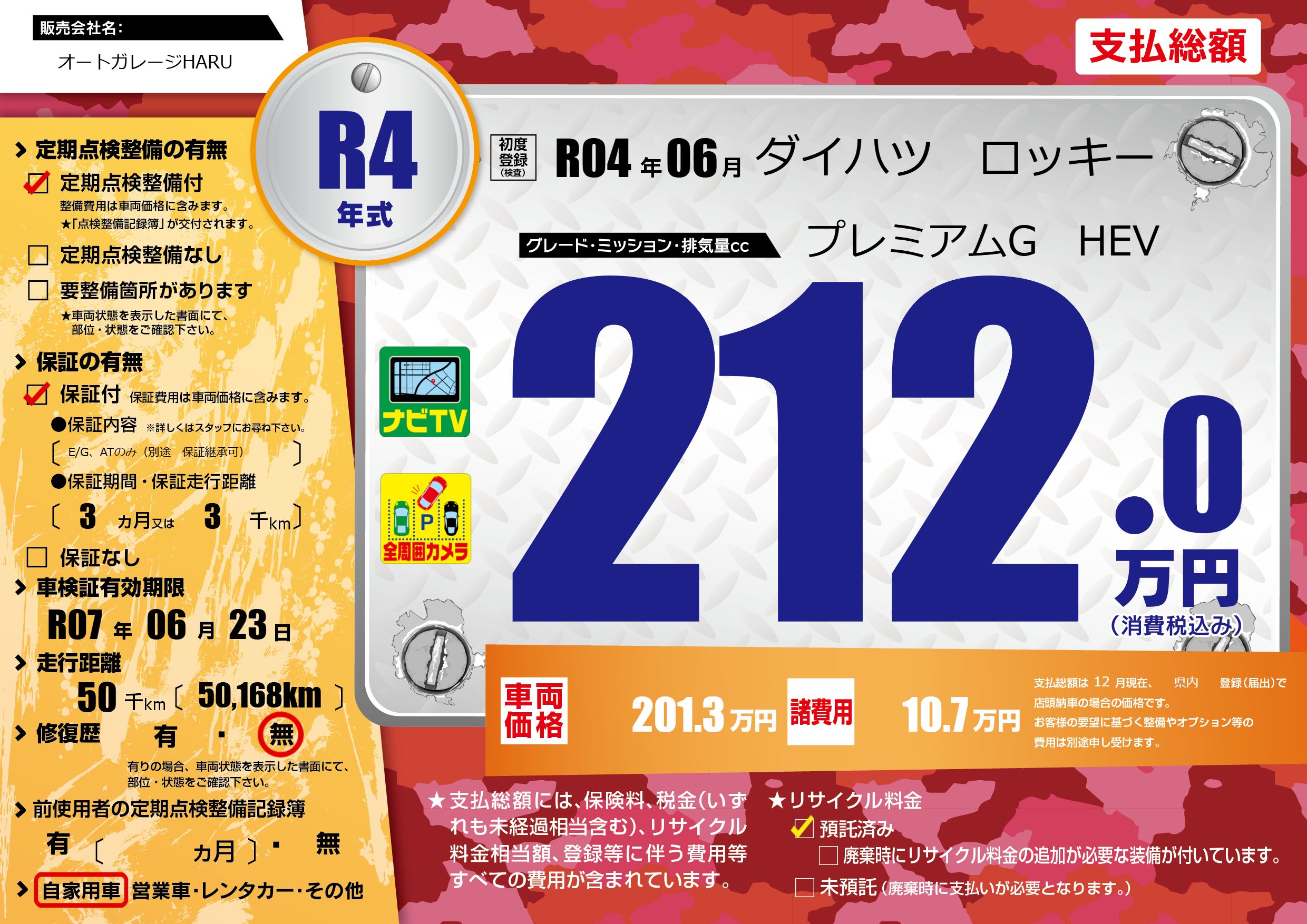 | 車名 | ダイハツ ロッキー | グレード ミッション 排気量 |
