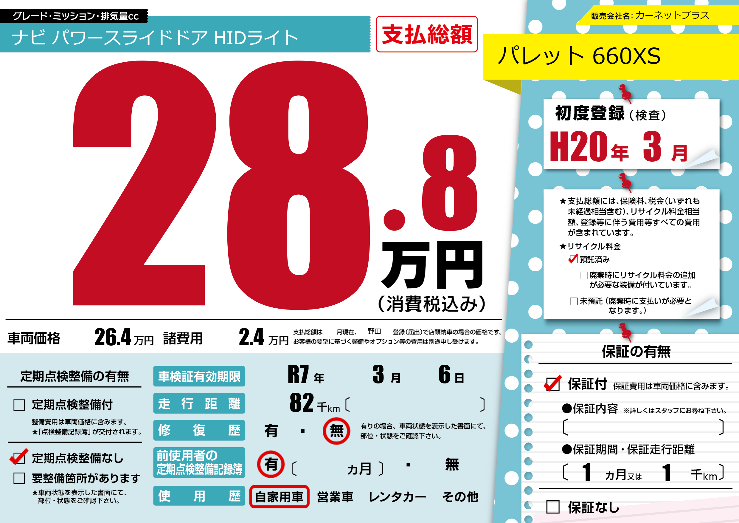 | 車名 | パレット 660XS | グレード ミッション 排気量 |