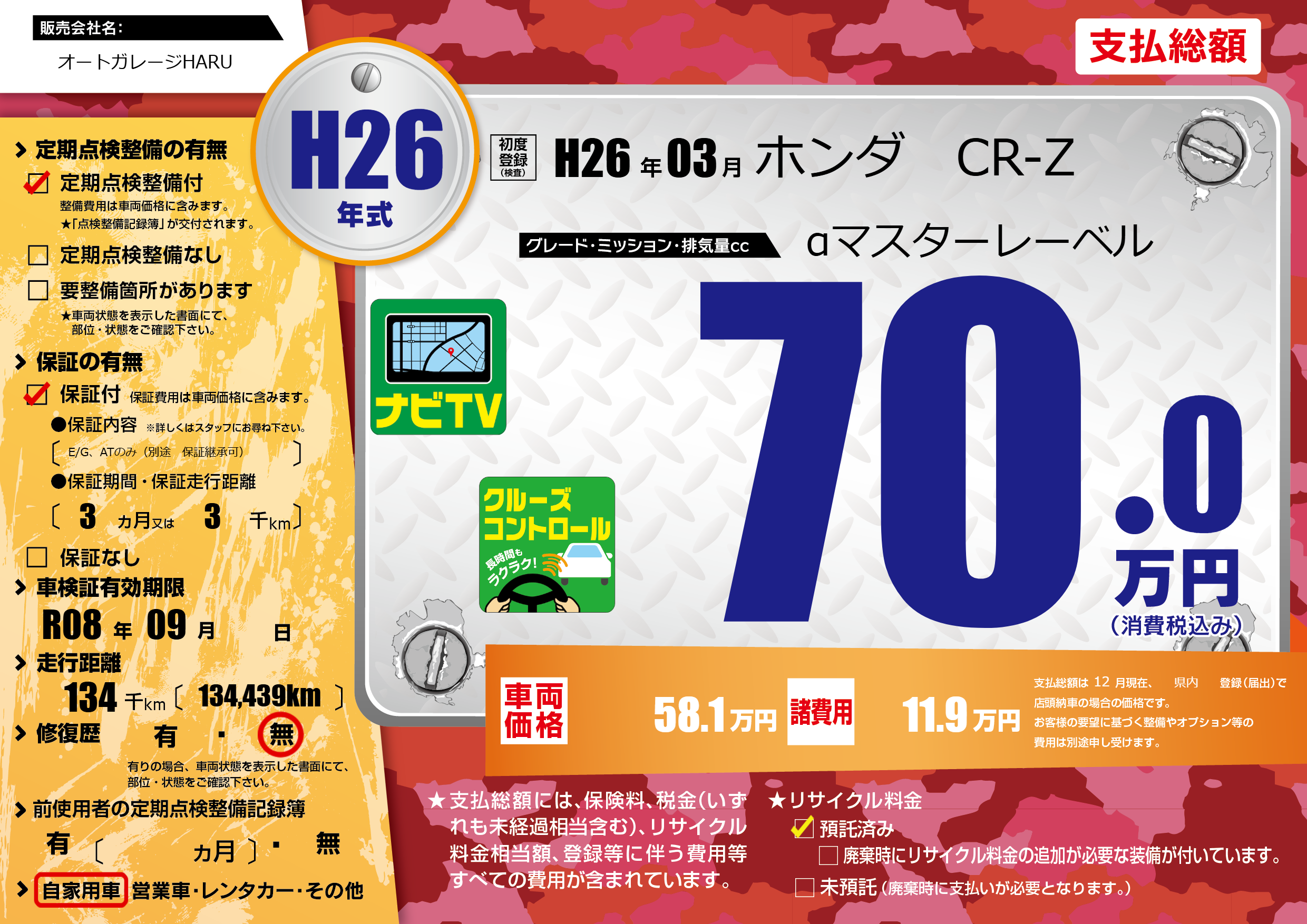 | 車名 | ホンダ CR-Z | グレード ミッション 排気量 |