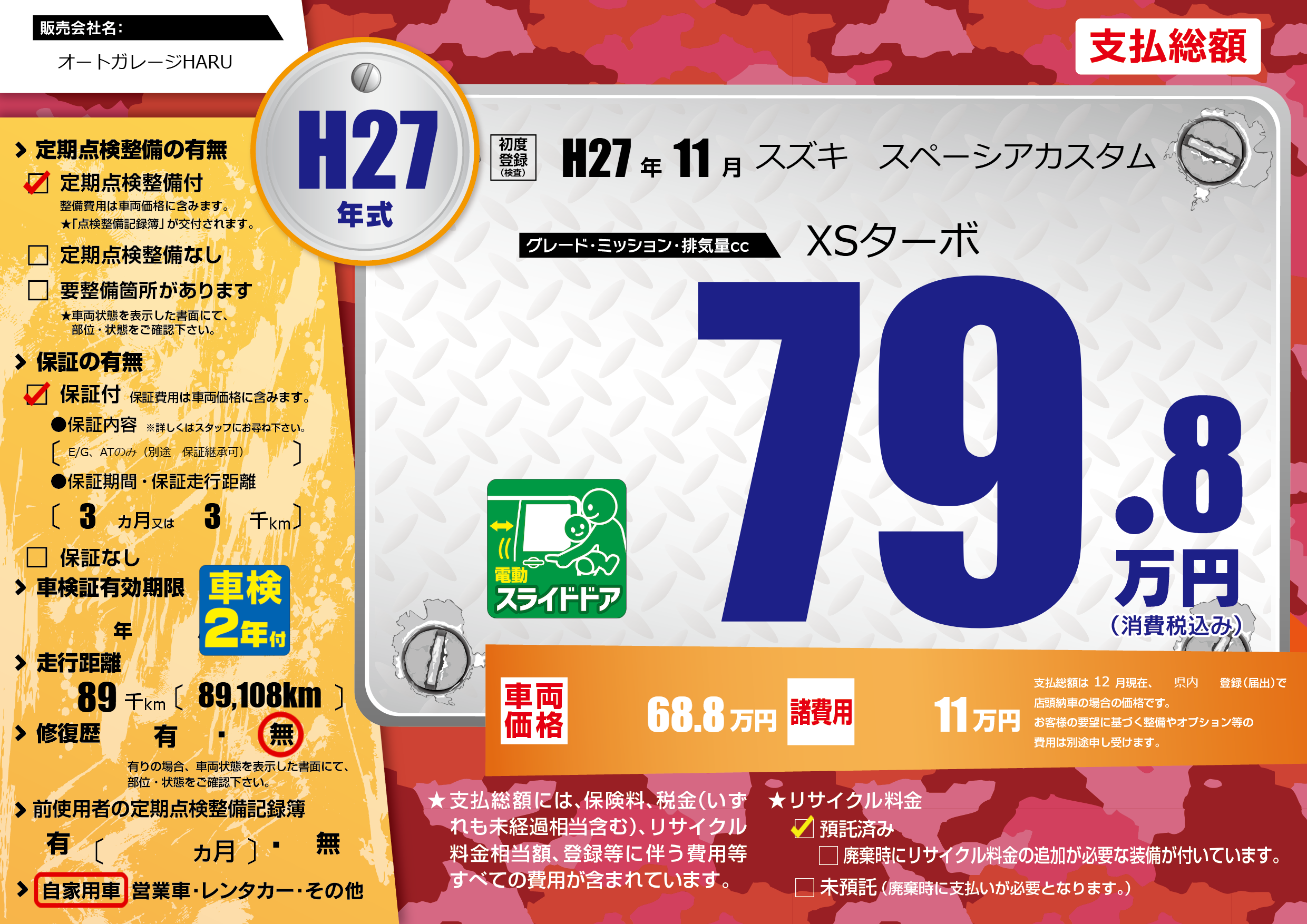 | 車名 | スズキ スペーシアカスタム | グレード ミッション 排気量 |