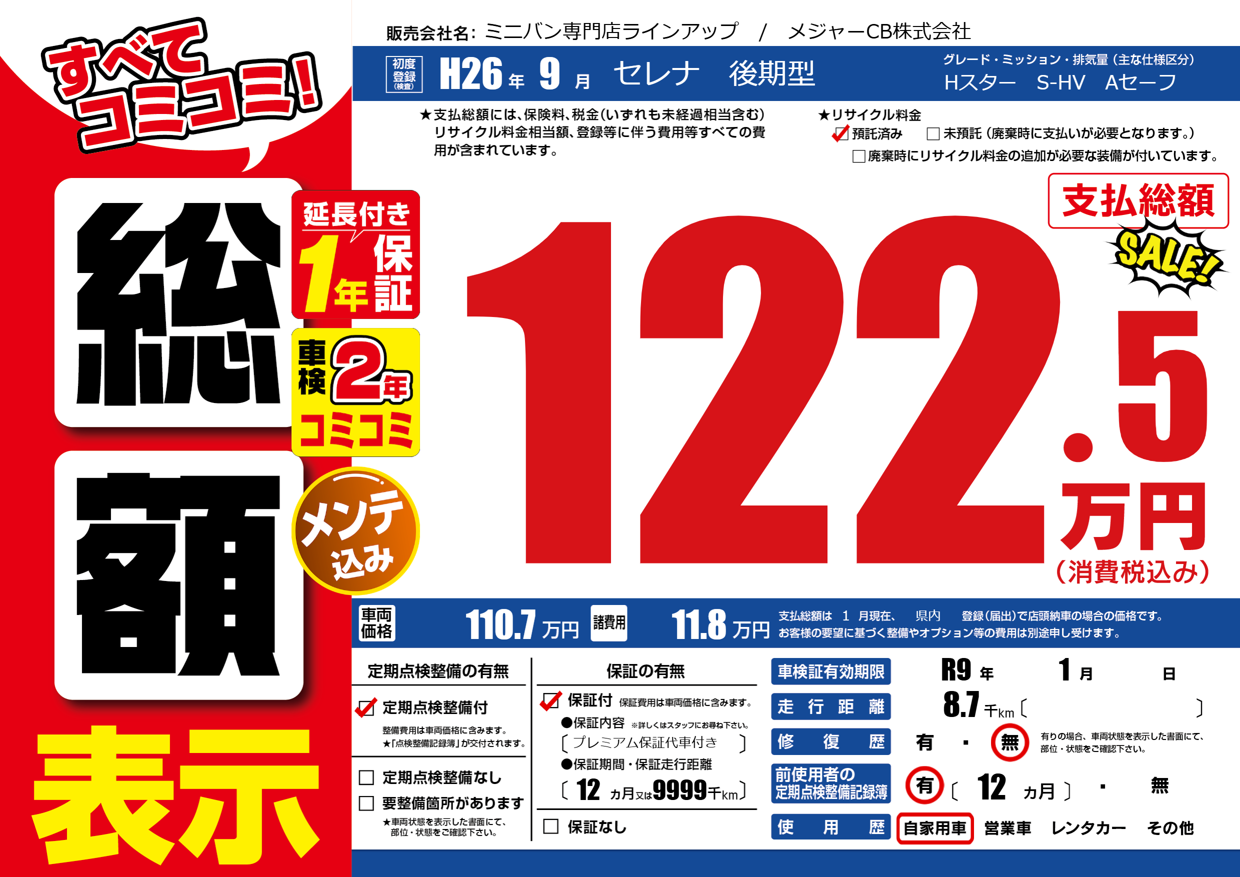 | 車名 | セレナ 後期型 | グレード ミッション 排気量 |