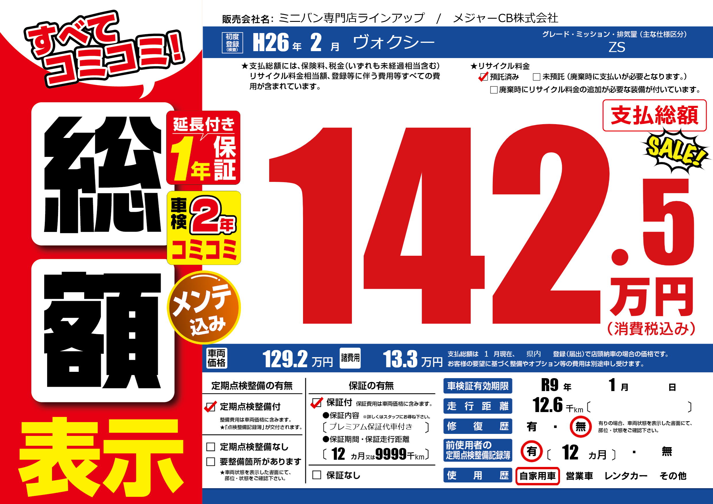 保証付き 保証内容(プレミアム保証代車付き) 12ヶ月または(9999)千kmまで |