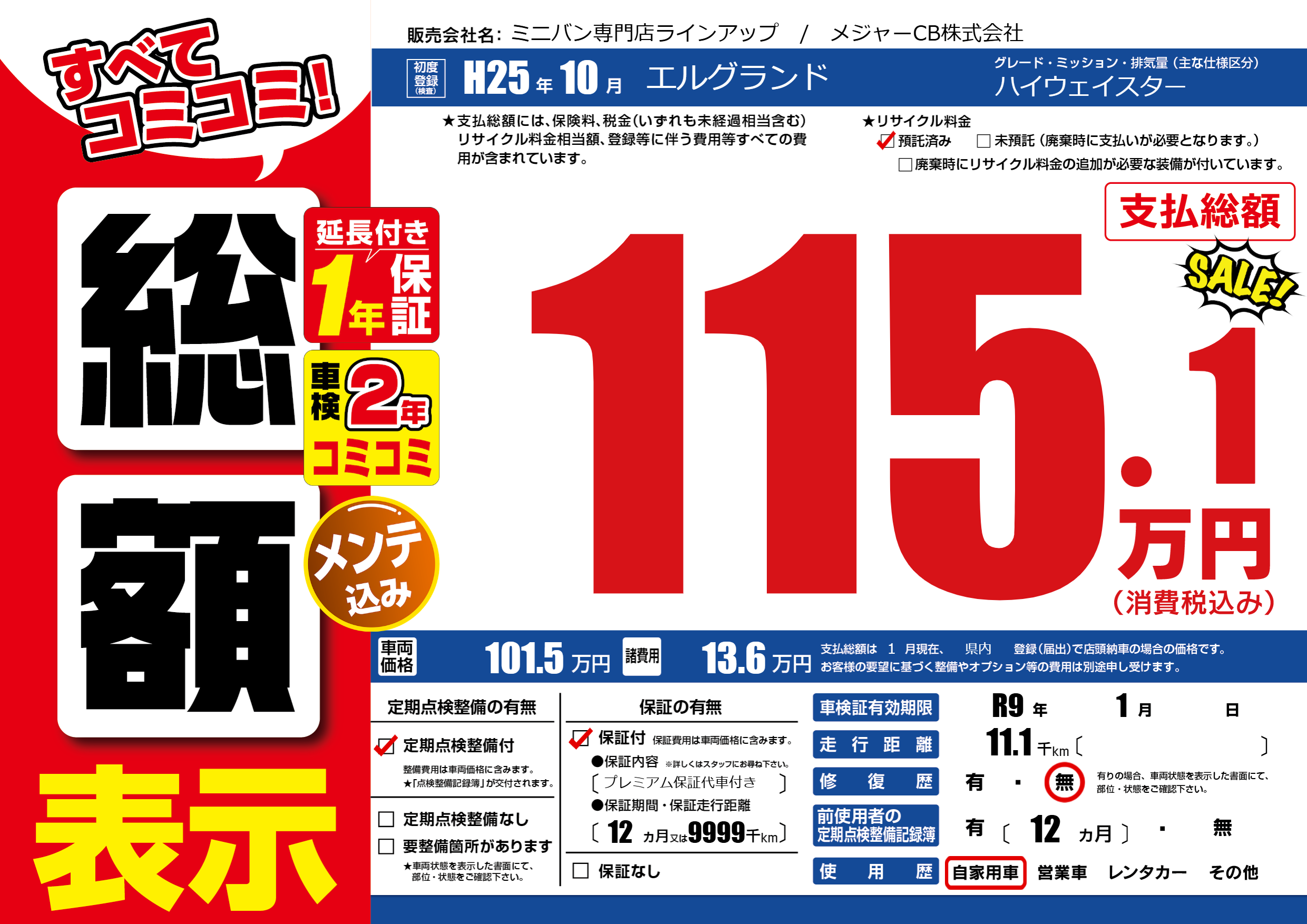 | 車名 | エルグランド | グレード ミッション 排気量 |