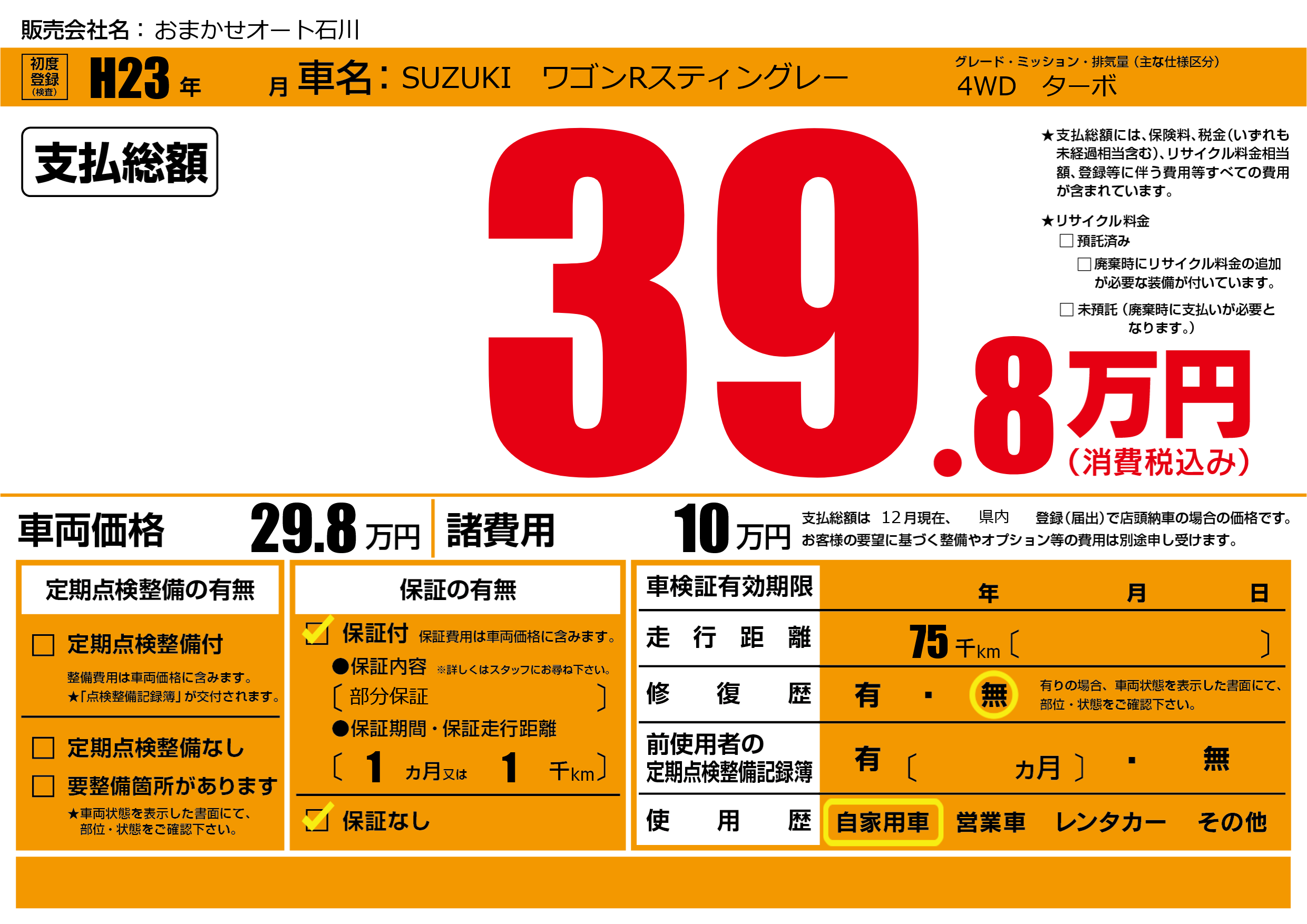 | 車名 | SUZUKI ワゴンRスティングレー | グレード ミッション 排気量 |