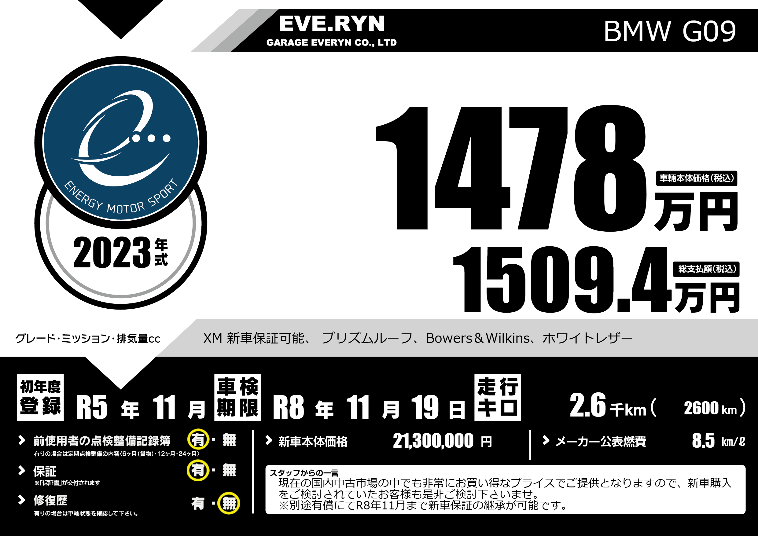 | 車名 | BMW G09 | グレード ミッション 排気量 |
