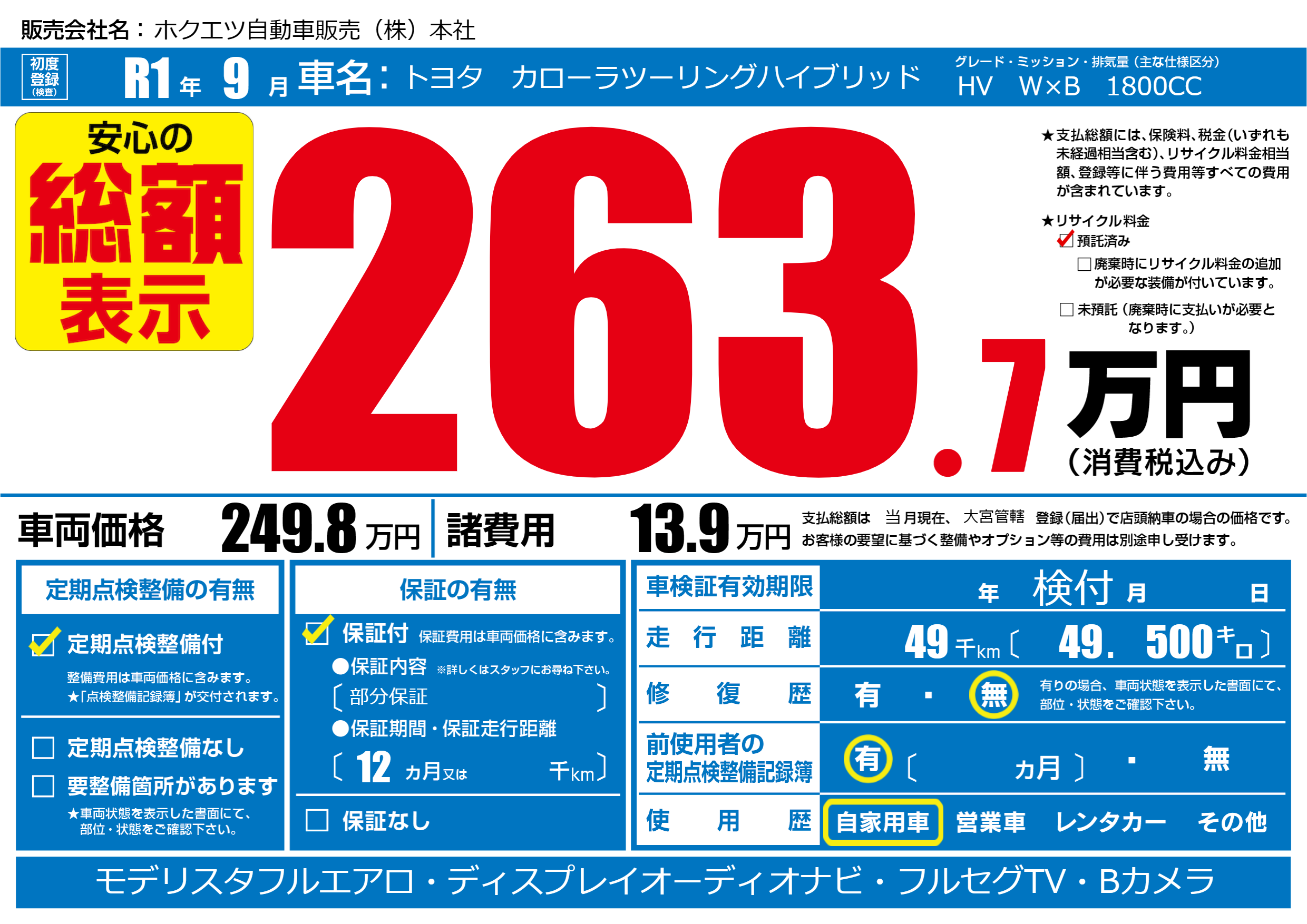 | 車名 | トヨタ カローラツーリングハイブリッド | グレード ミッション 排気量 |