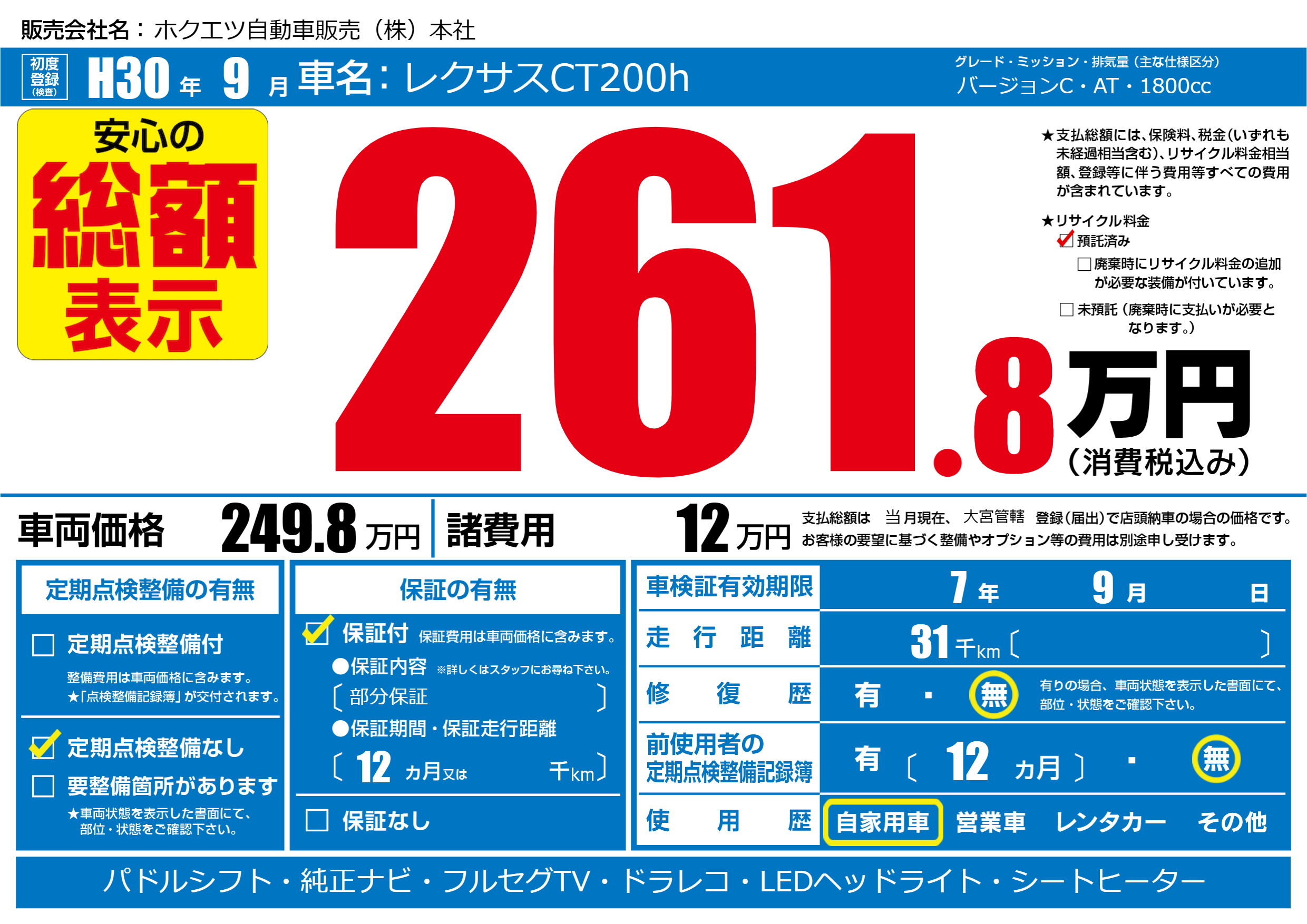 | 車名 | レクサスCT200h | グレード ミッション 排気量 |