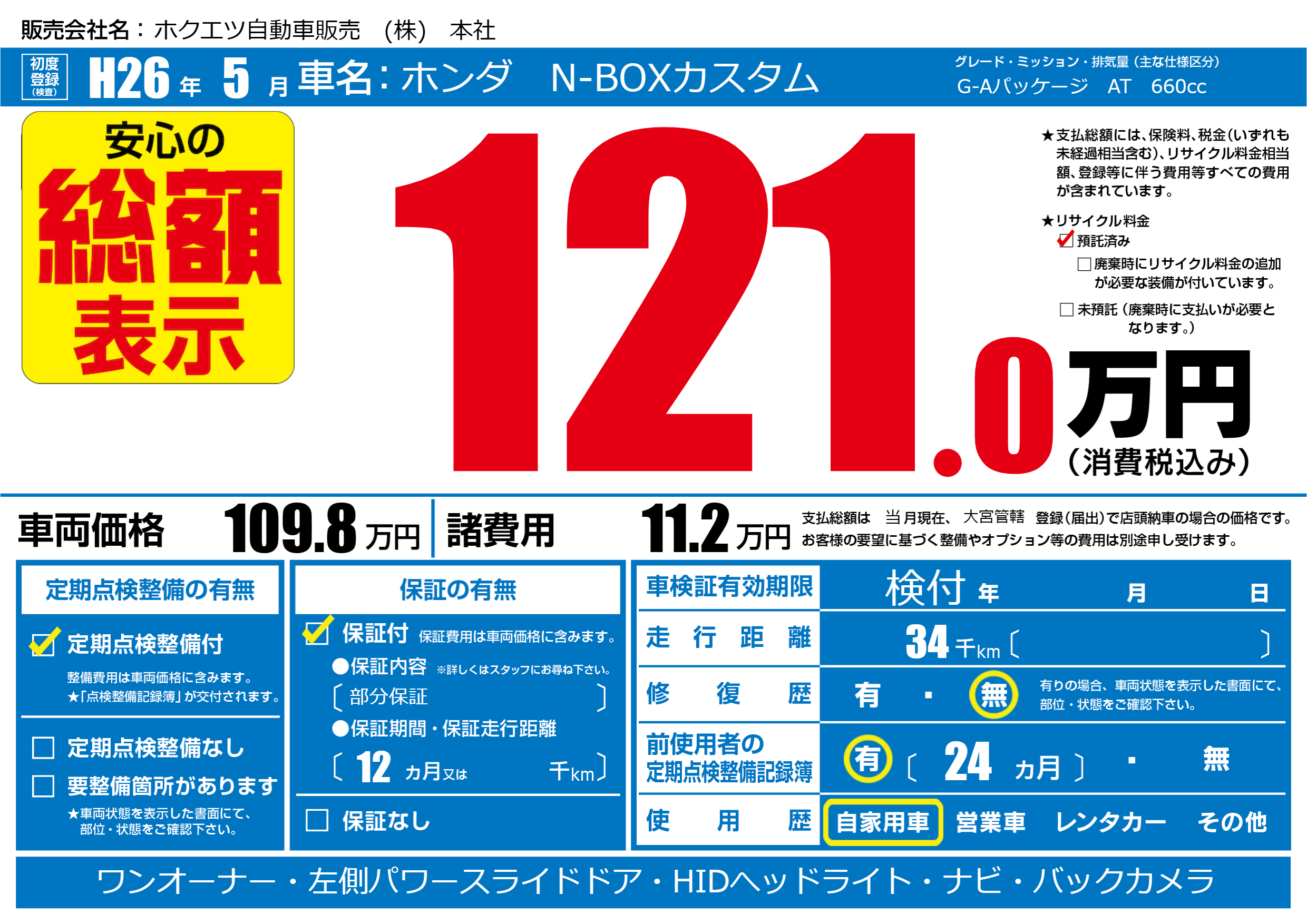 | 車名 | ホンダ N-BOXカスタム | グレード ミッション 排気量 |