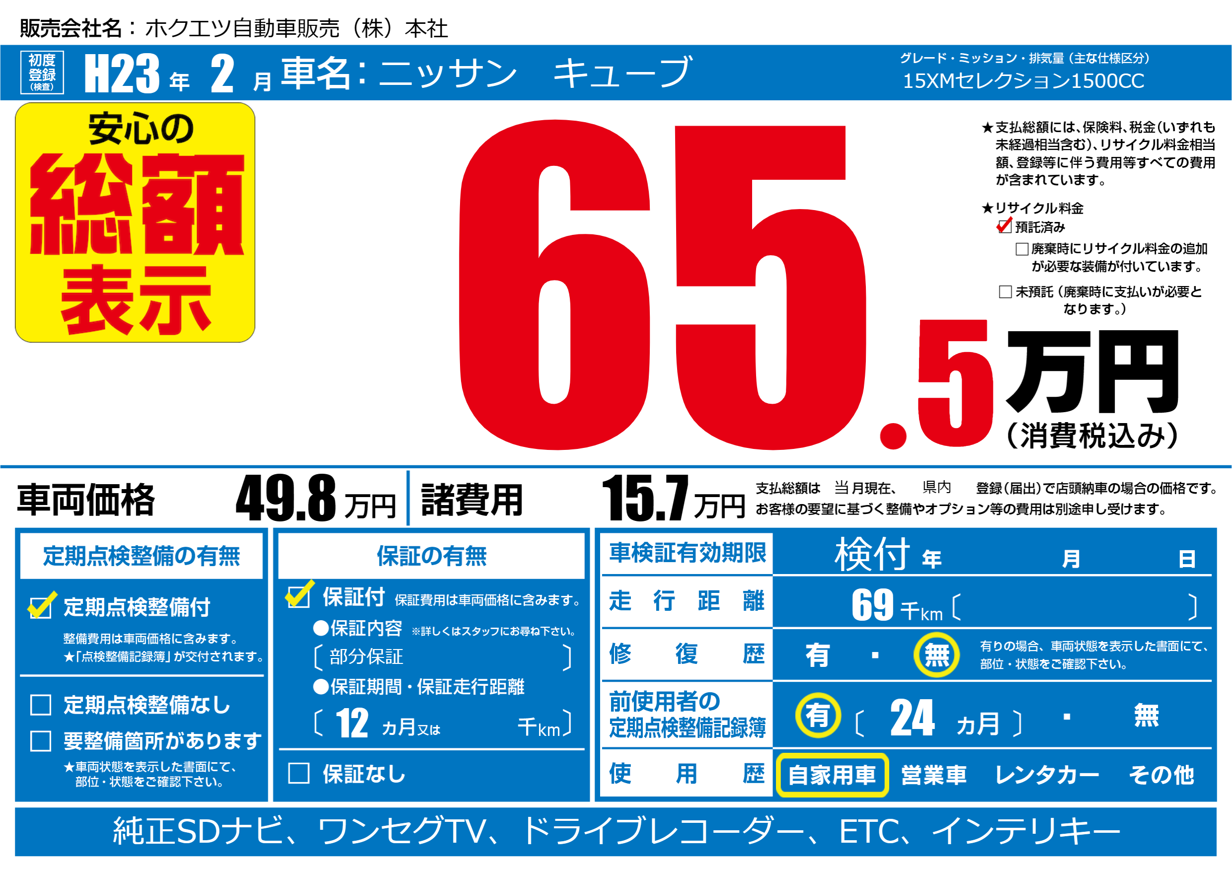 | 車名 | ニッサン キューブ | グレード ミッション 排気量 |