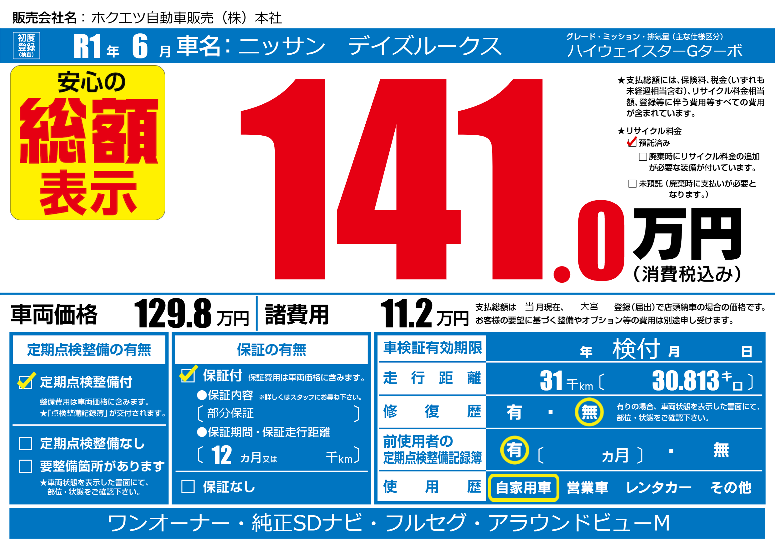 | 車名 | ニッサン デイズルークス | グレード ミッション 排気量 |