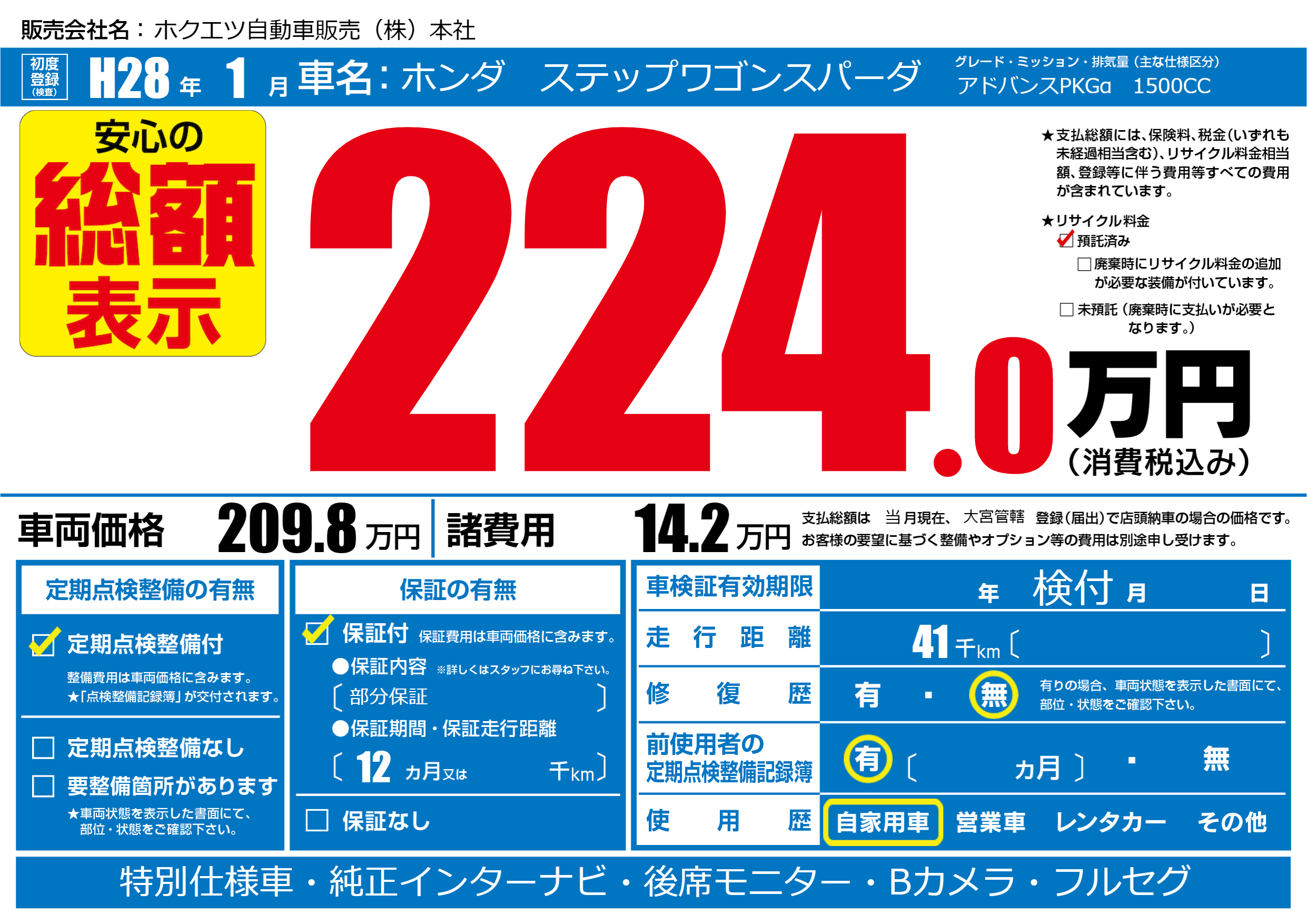 | 走行キロ | 4.1万km | 初年度登録 | H28年1月 |