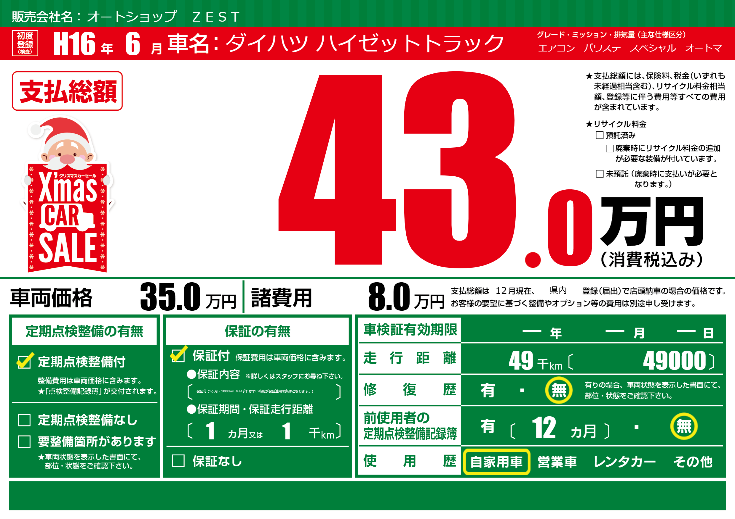 | 走行キロ | 4.9万km | 初年度登録 | H16年6月 |