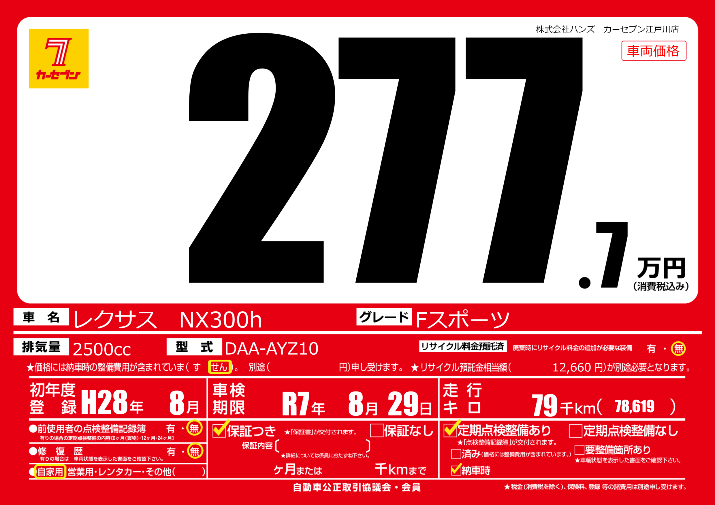 | 車名 | レクサス NX300h | グレード ミッション 排気量 |