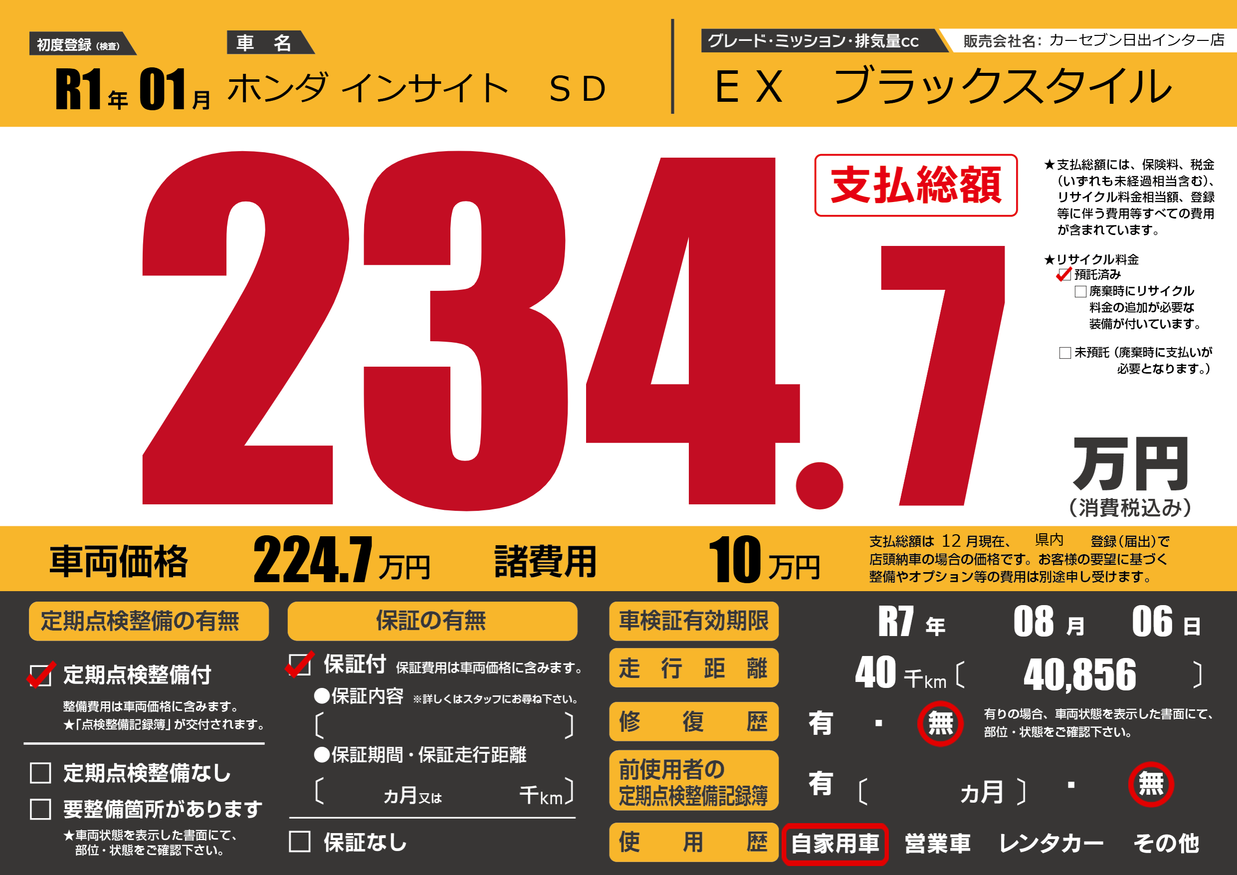 | 車名 | ホンダ インサイト SD | グレード ミッション 排気量 |