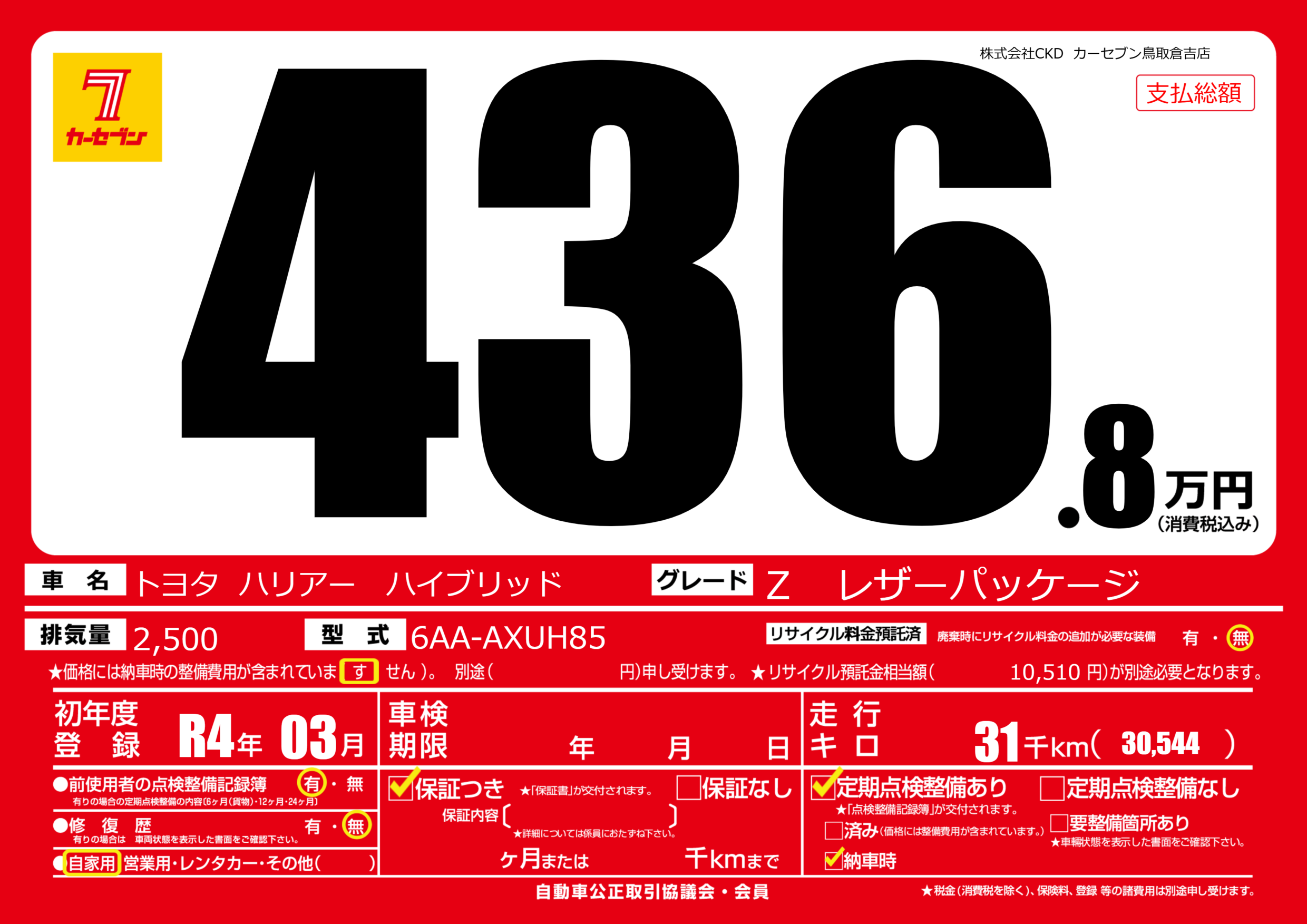 | 車名 | トヨタ ハリアー ハイブリッド | グレード ミッション 排気量 |