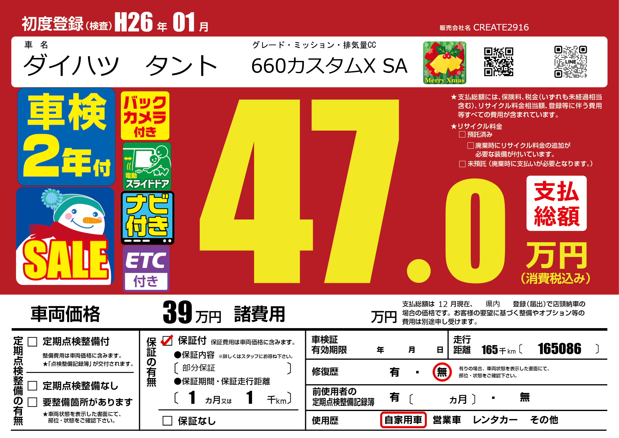 | 走行キロ | 16.5万km | 初年度登録 | H26年01月 |
