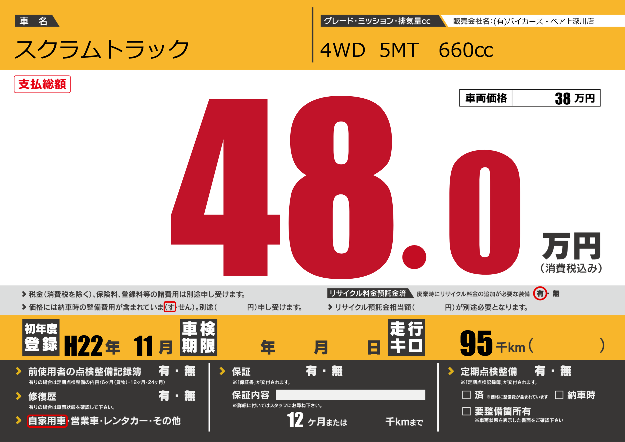 保証なし 保証内容(---) 12ヶ月または()千kmまで |