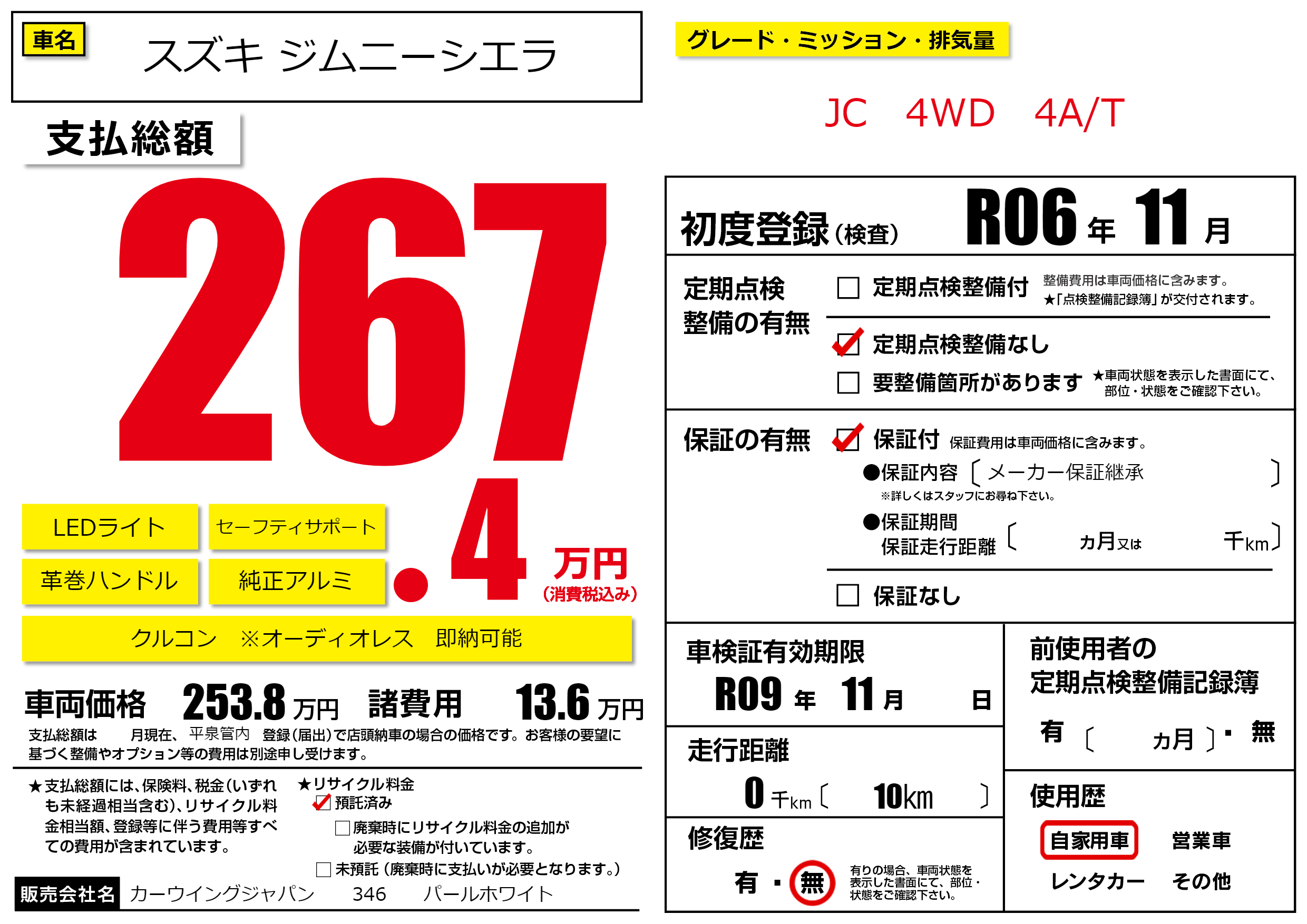 | 車名 | スズキ ジムニーシエラ | グレード ミッション 排気量 |