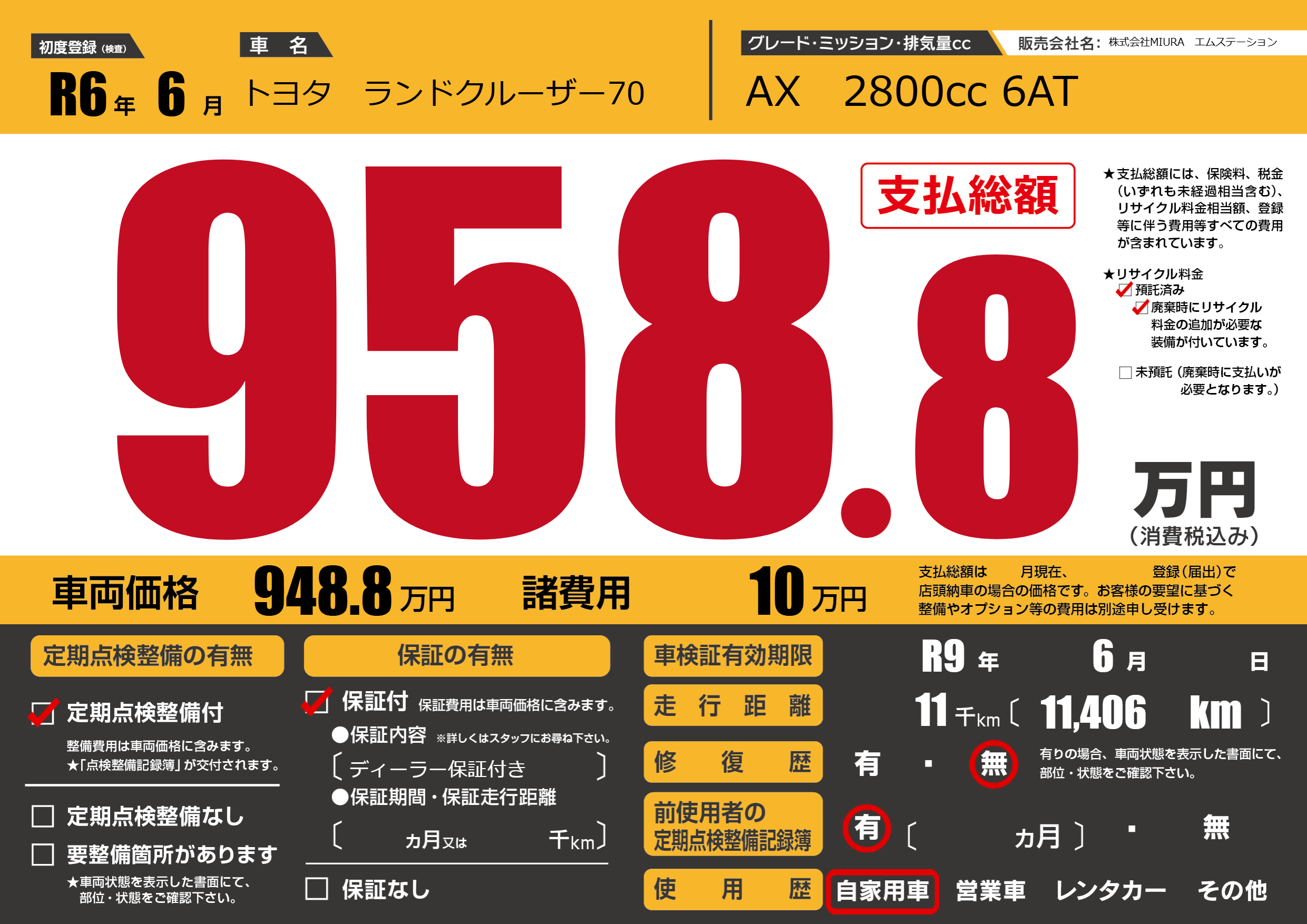| 走行キロ | 1.1万km | 初年度登録 | R6年6月 |