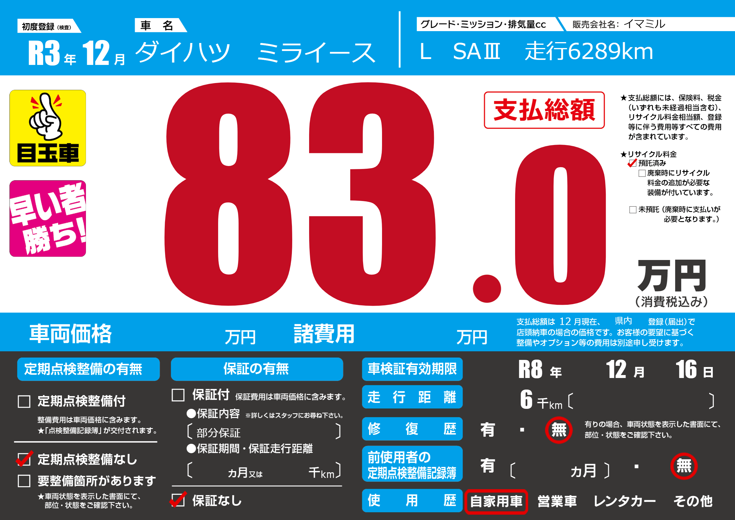 | 車名 | ダイハツ ミライース | グレード ミッション 排気量 |