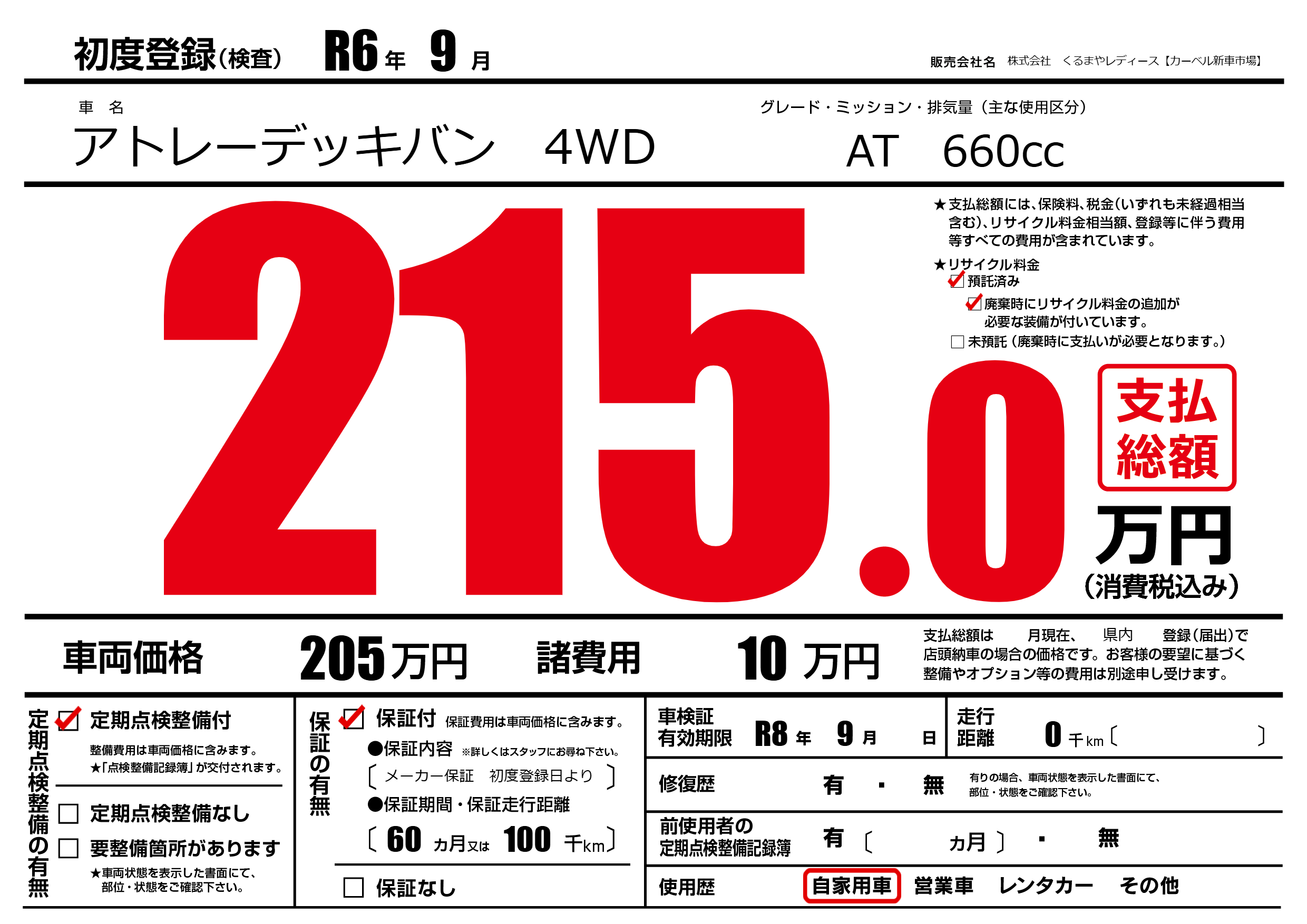 | 車名 | アトレーデッキバン 4WD | グレード ミッション 排気量 |