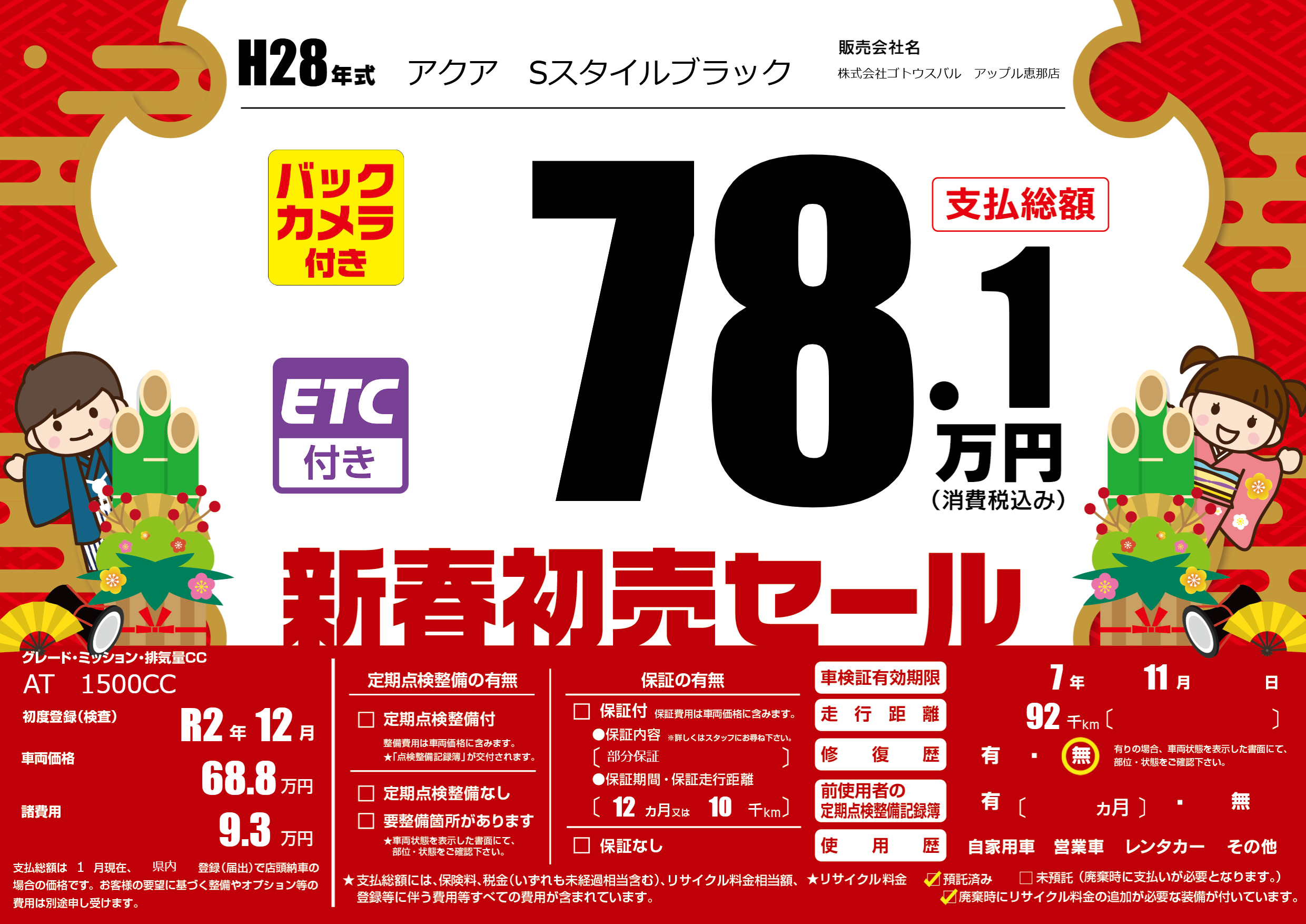 | 車名 | アクア Sスタイルブラック | グレード ミッション 排気量 |