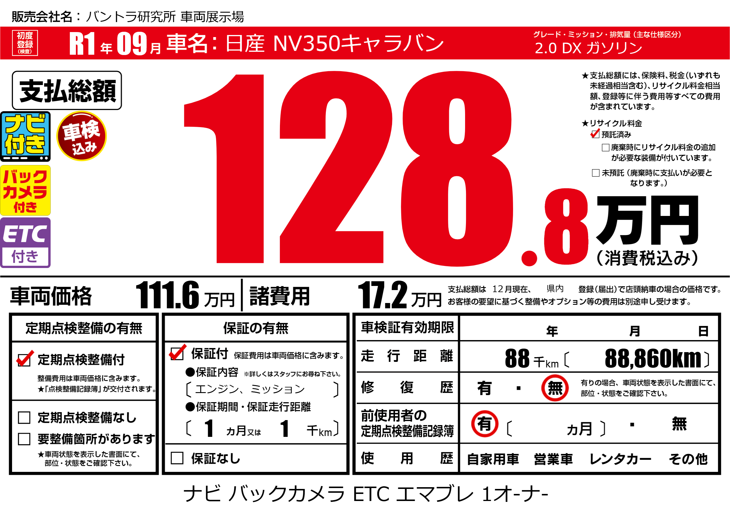 | 車名 | 日産 NV350キャラバン | グレード ミッション 排気量 |