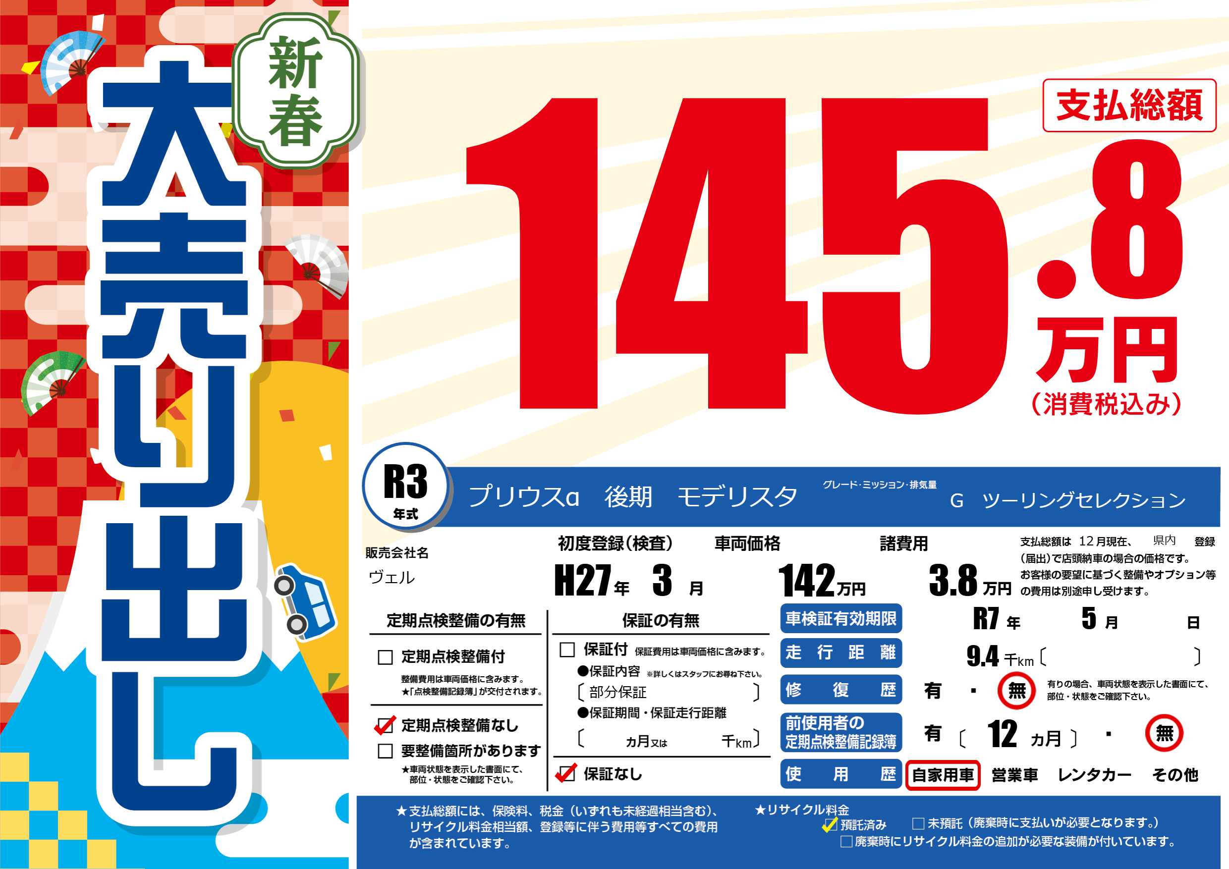 | 走行キロ | 0.9万km | 初年度登録 | H27年3月 |