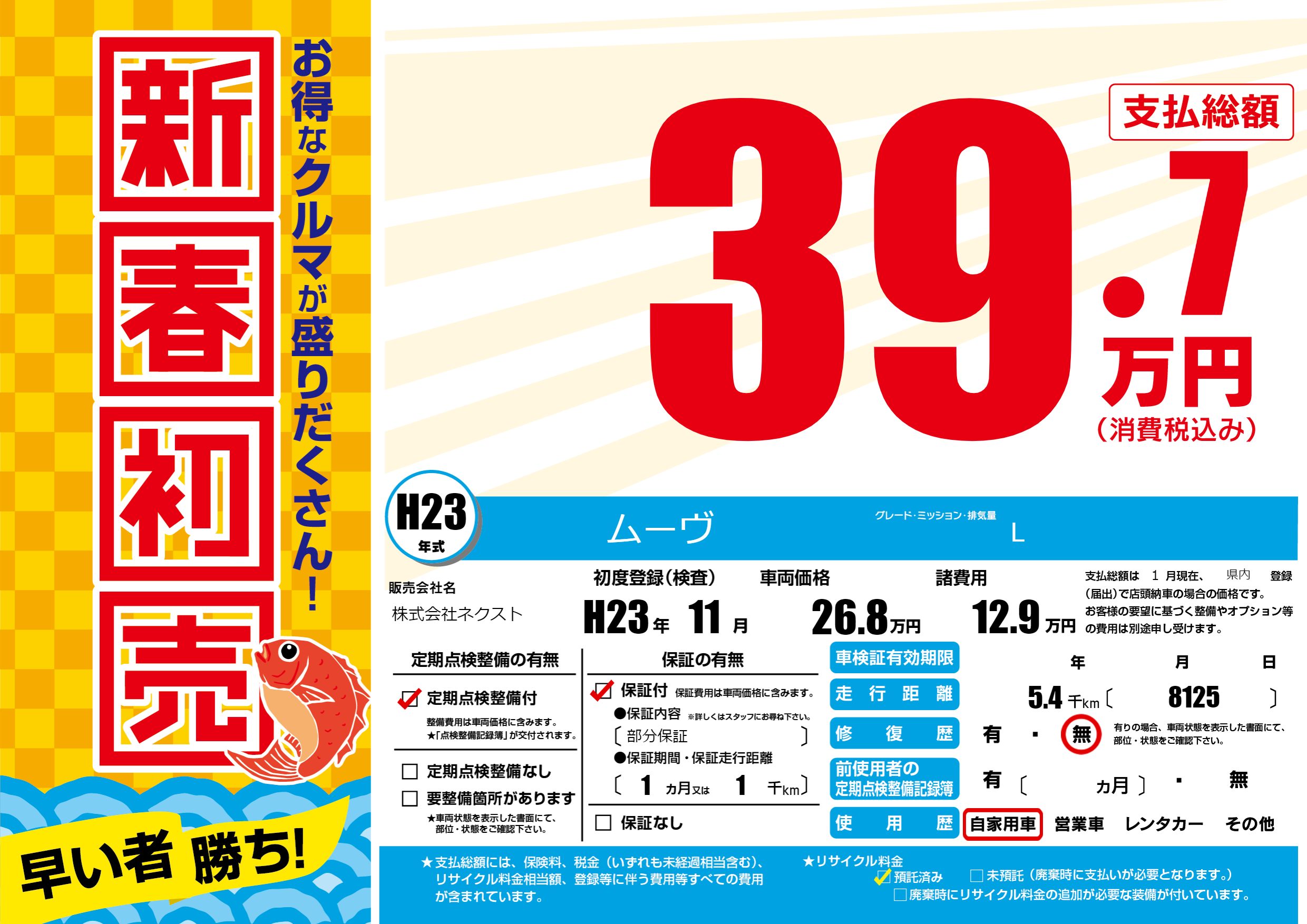 | 走行キロ | 0.5万km | 初年度登録 | H23年11月 |