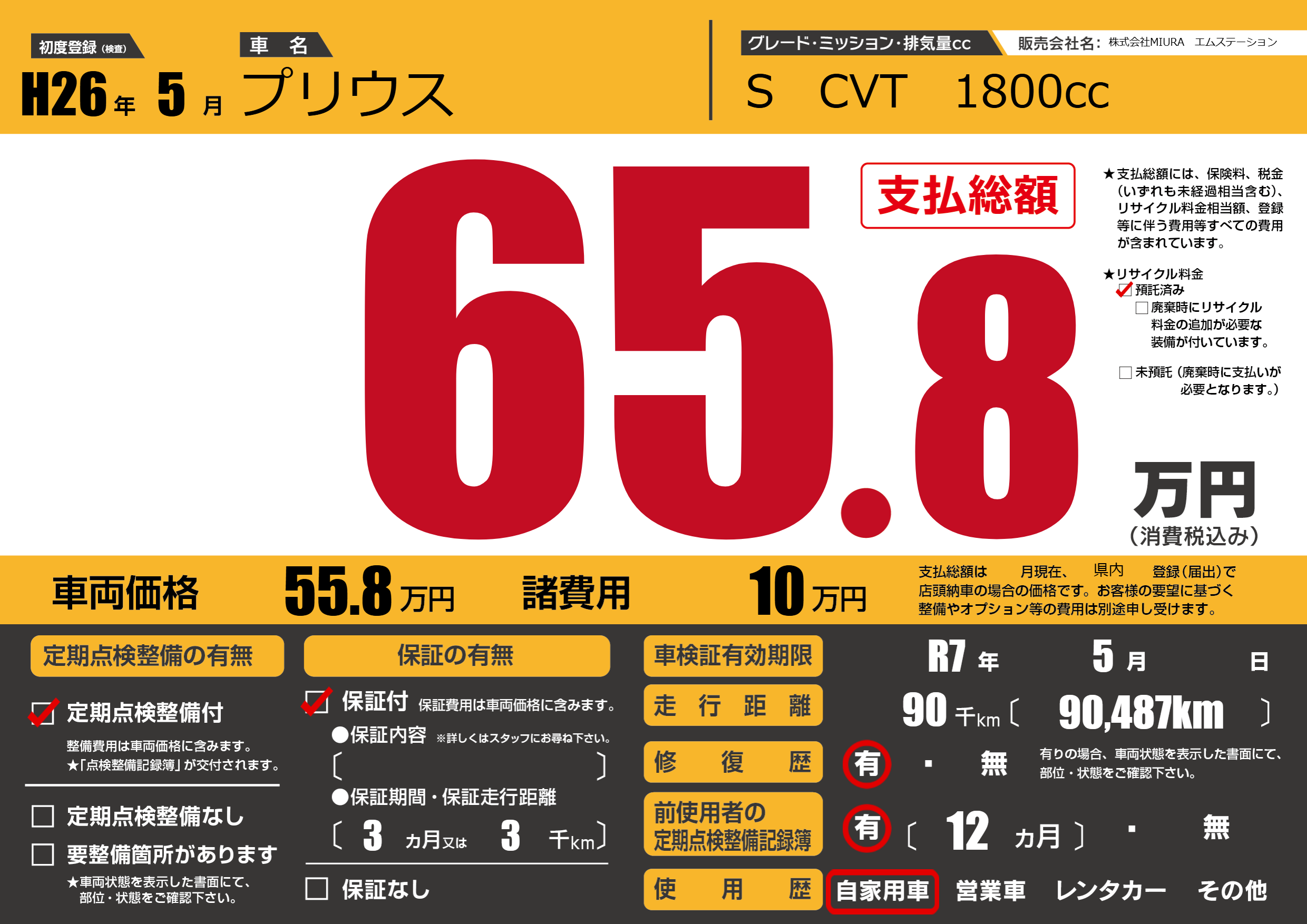| 走行キロ | 9万km | 初年度登録 | H26年5月 |