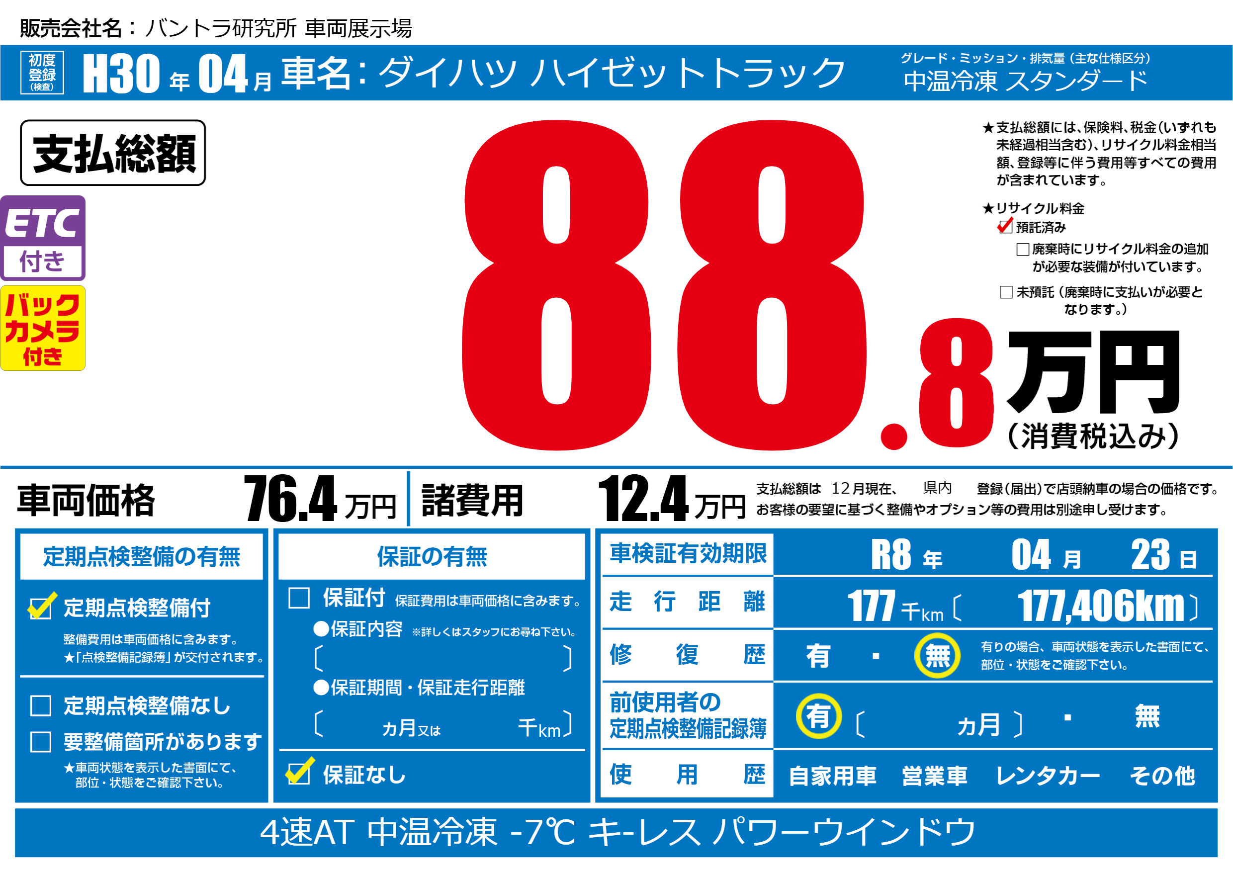 | 車名 | ダイハツ ハイゼットトラック | グレード ミッション 排気量 |