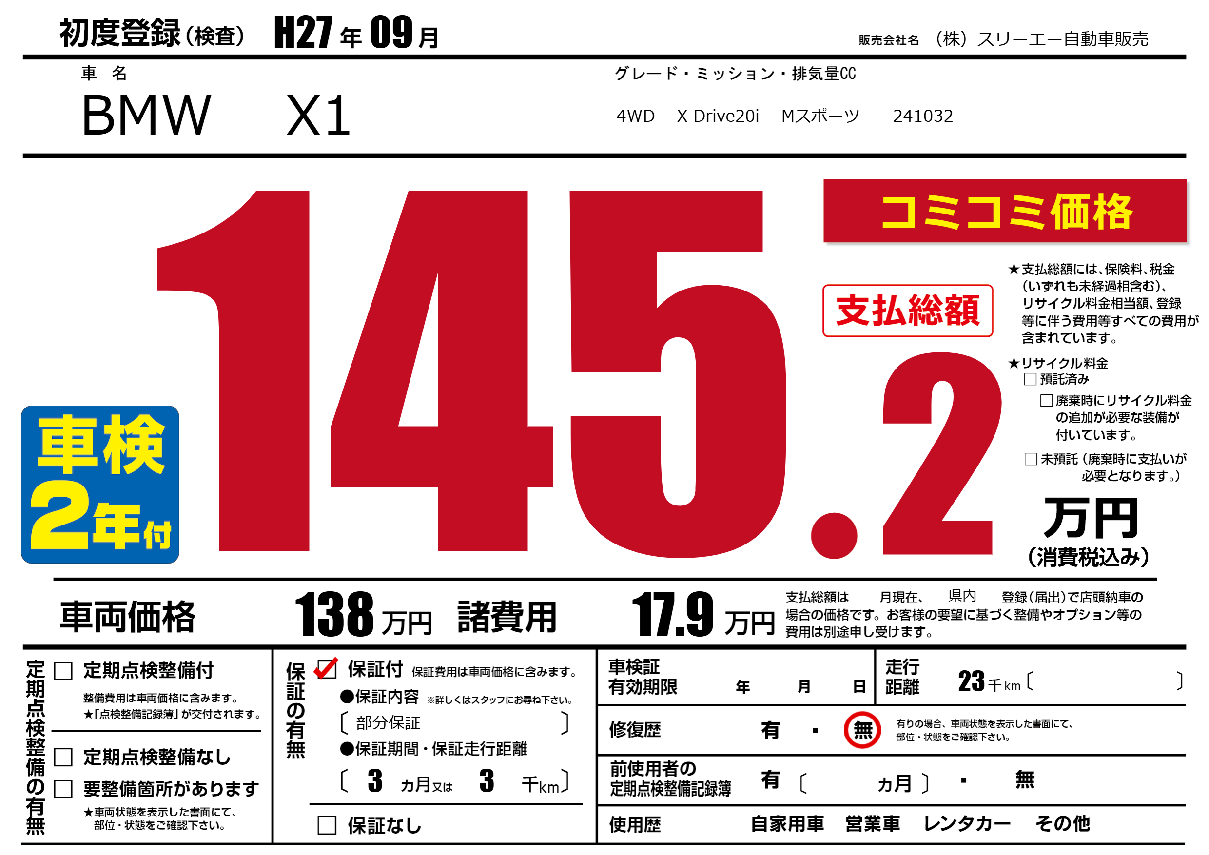 | 車名 | BMW X1 | グレード ミッション 排気量 |
