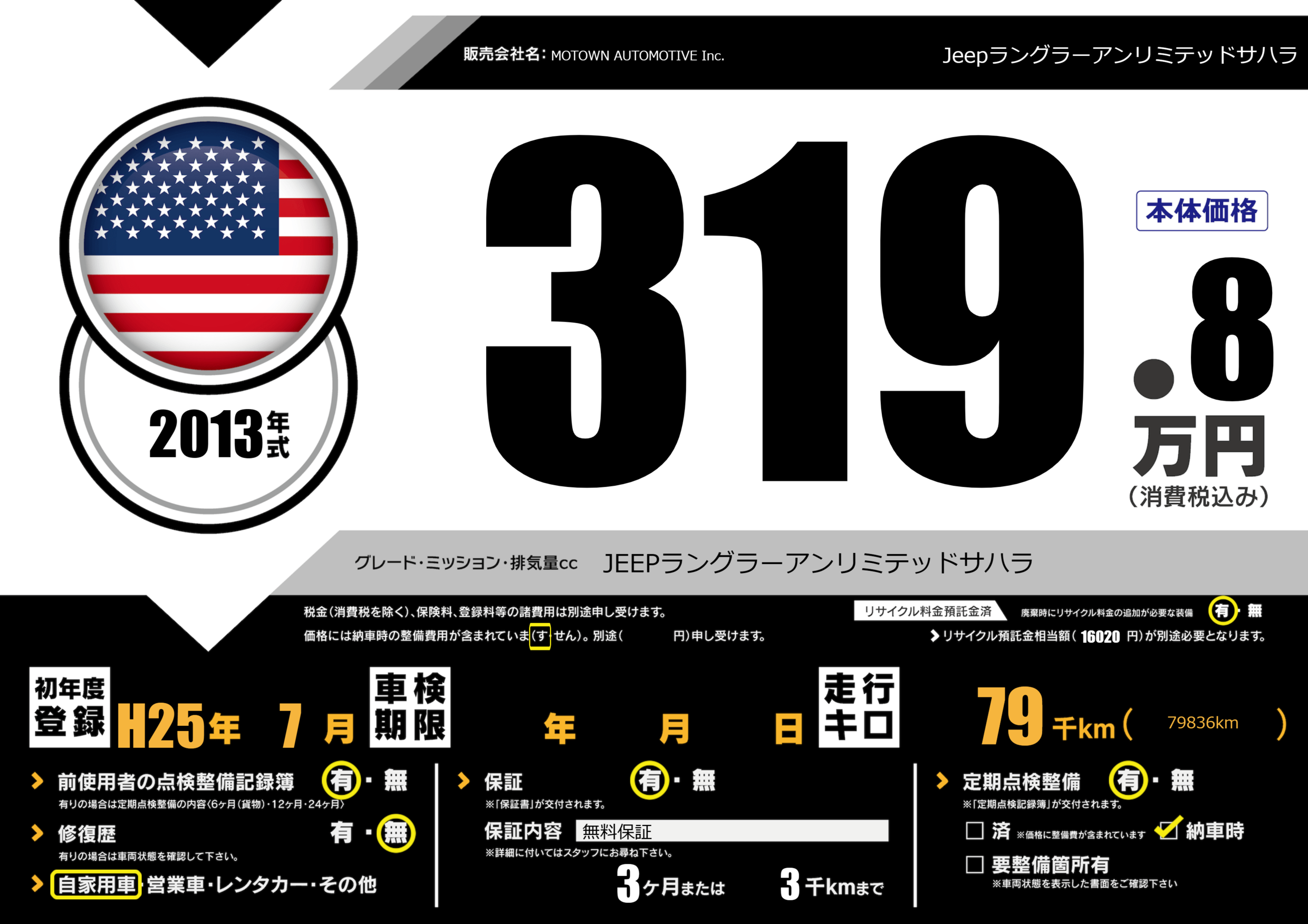 | 車名 | Jeepラングラーアンリミテッドサハラ | グレード ミッション 排気量 |