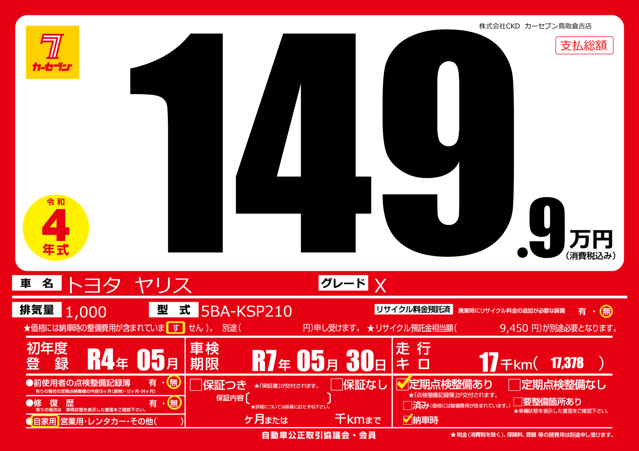 | 車名 | トヨタ ヤリス | グレード ミッション 排気量 |