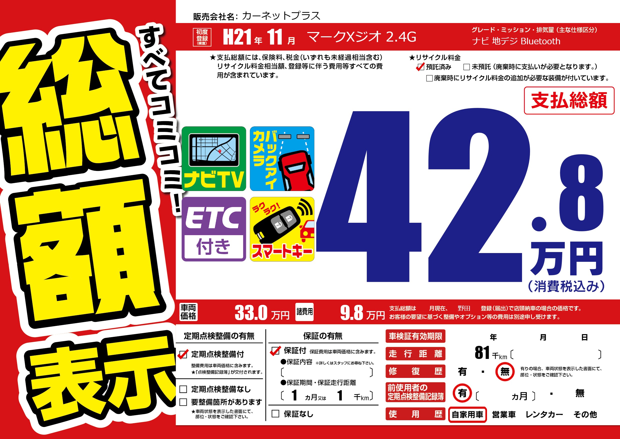 | 走行キロ | 8.1万km | 初年度登録 | H21年11月 |