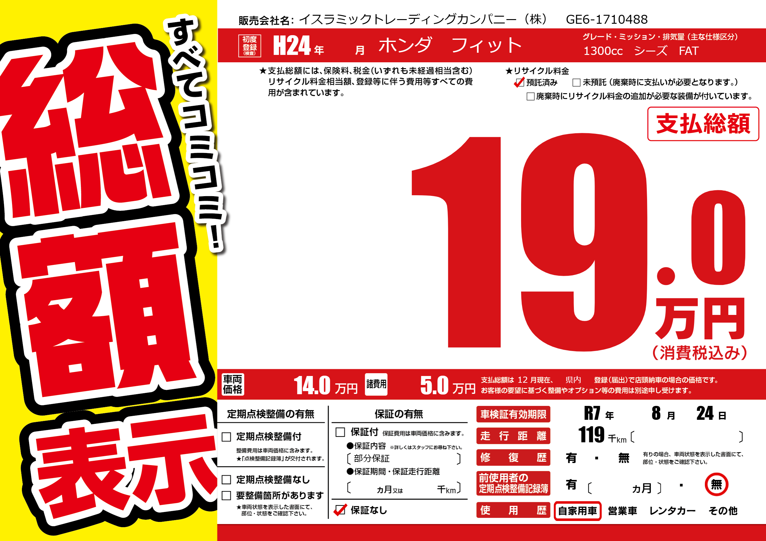 | 車名 | ホンダ フィット | グレード ミッション 排気量 |