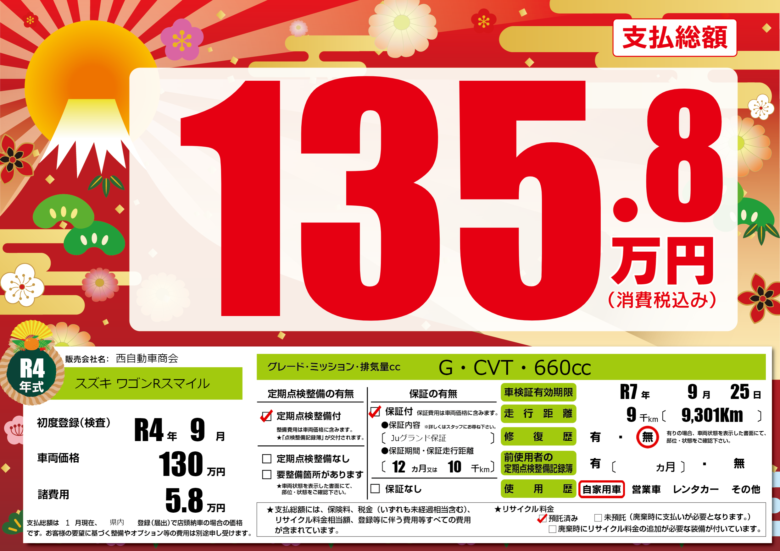 | 走行キロ | 0.9万km | 初年度登録 | R4年9月 |